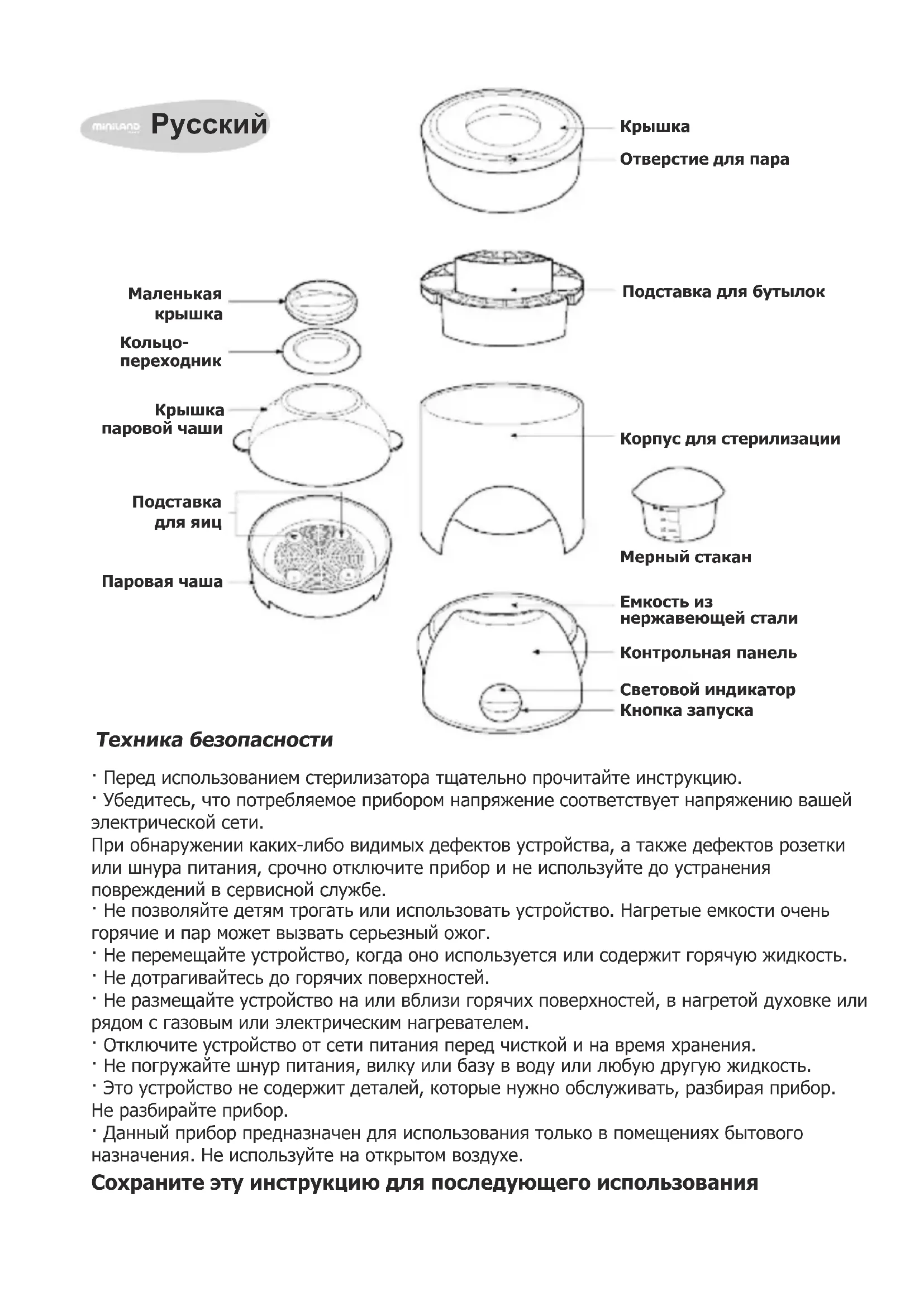 нержавеющей стали Контрольная панель Световой индикатор Кнопка запуска Техника безопасности PусскийИнструкция по работе с прибором Перед размещением предметов в устройство для стерилизации важно, чтобы все бутылочки, соски и другие аксессуары были пустыми и промытыми в чистой воде.