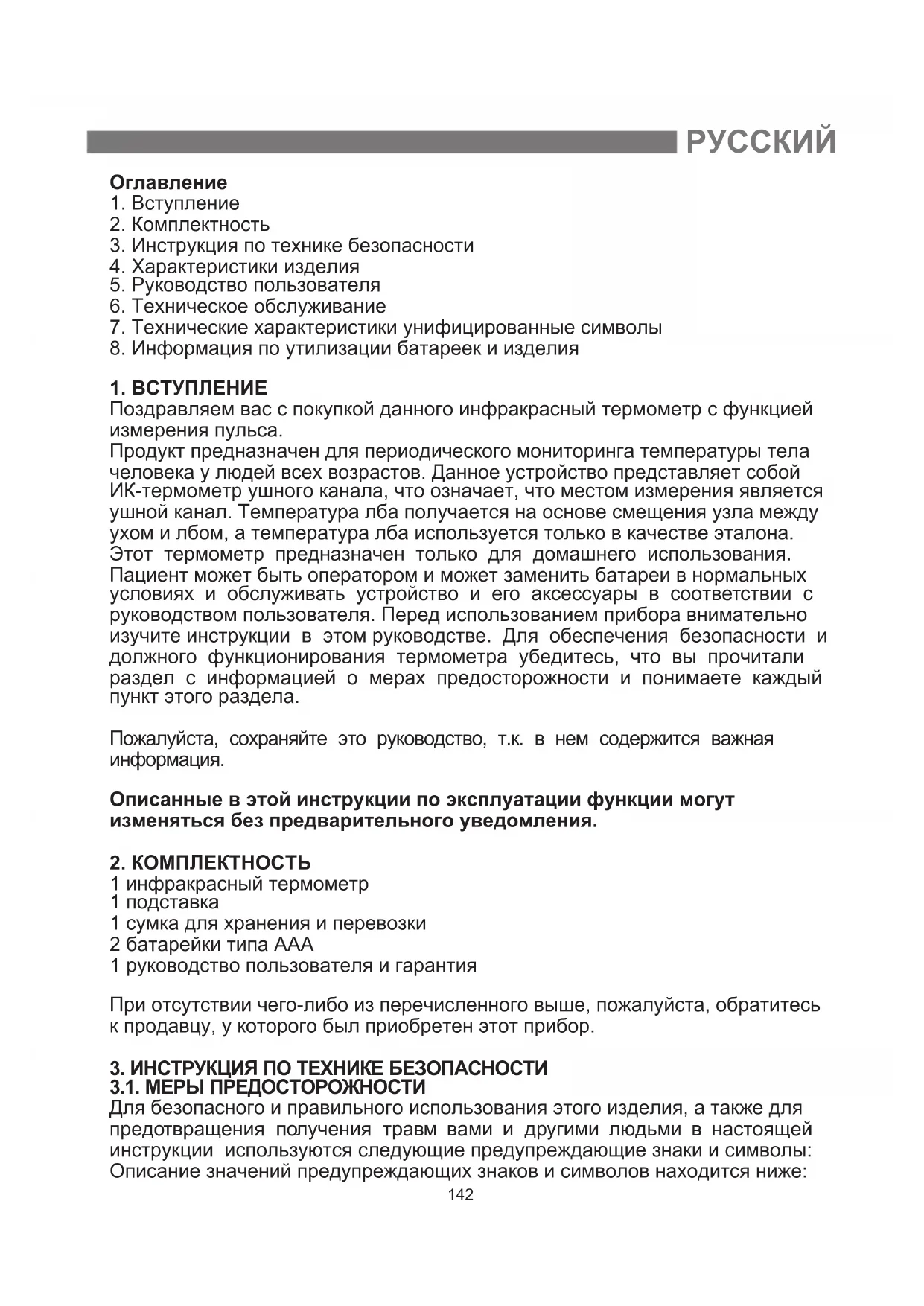 Поздравляем вас с покупкой данного инфракрасный термометр с функцией измерения пульса. Продукт предназначен для периодического мониторинга температуры тела человека у людей всех возрастов. Данное устройство представляет собой ИК-термометр ушного канала, что означает, что местом измерения является ушной канал. Температура лба получается на основе смещения узла между ухом и лбом, а температура лба используется только в качестве эталона. Этот термометр предназначен только для домашнего использования. Пациент может быть оператором и может заменить батареи в нормальных условиях и обслуживать устройство и его аксессуары в соответствии с руководством пользователя. Перед использованием прибора внимательно изучите инструкции в этом руководстве. Для обеспечения безопасности и должного функционирования термометра убедитесь, что вы прочитали раздел с информацией о мерах предосторожности и понимаете каждый пункт этого раздела. Пожалуйста, сохраняйте это руководство, т.к. в нем содержится важная информация. Описанные в этой инструкции по эксплуатации функции могут изменяться без предварительного уведомления.
