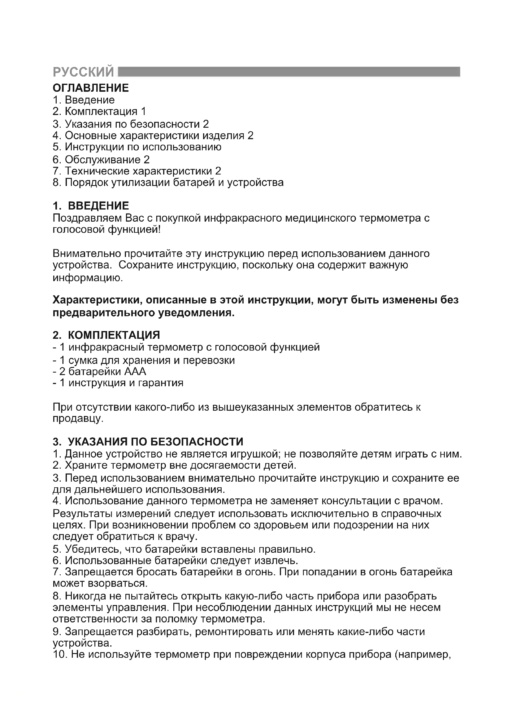 Поздравляем Вас с покупкой инфракрасного медицинского термометра с голосовой функцией! Внимательно прочитайте эту инструкцию перед использованием данного устройства. Сохраните инструкцию, поскольку она содержит важную информацию. Характеристики, описанные в этой инструкции, могут быть изменены без предварительного уведомления.