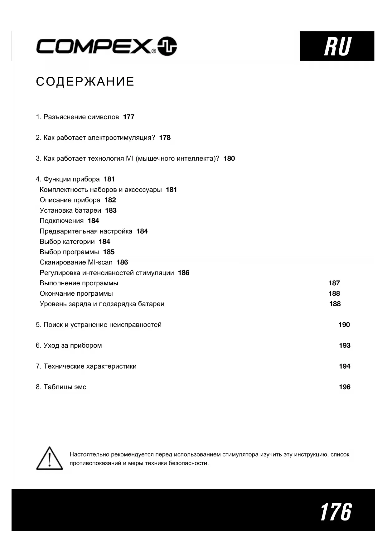 Комплектность наборов и аксессуары 181 Описание прибора 182 Установка батареи 183 Подключения 184 Предварительная настройка 184 Выбор категории 184 Выбор программы 185 Сканирование MI-scan 186 Регулировка интенсивностей стимуляции 186 Выполнение программы 187 Окончание программы 188 Уровень заряда и подзарядка батареи 188
