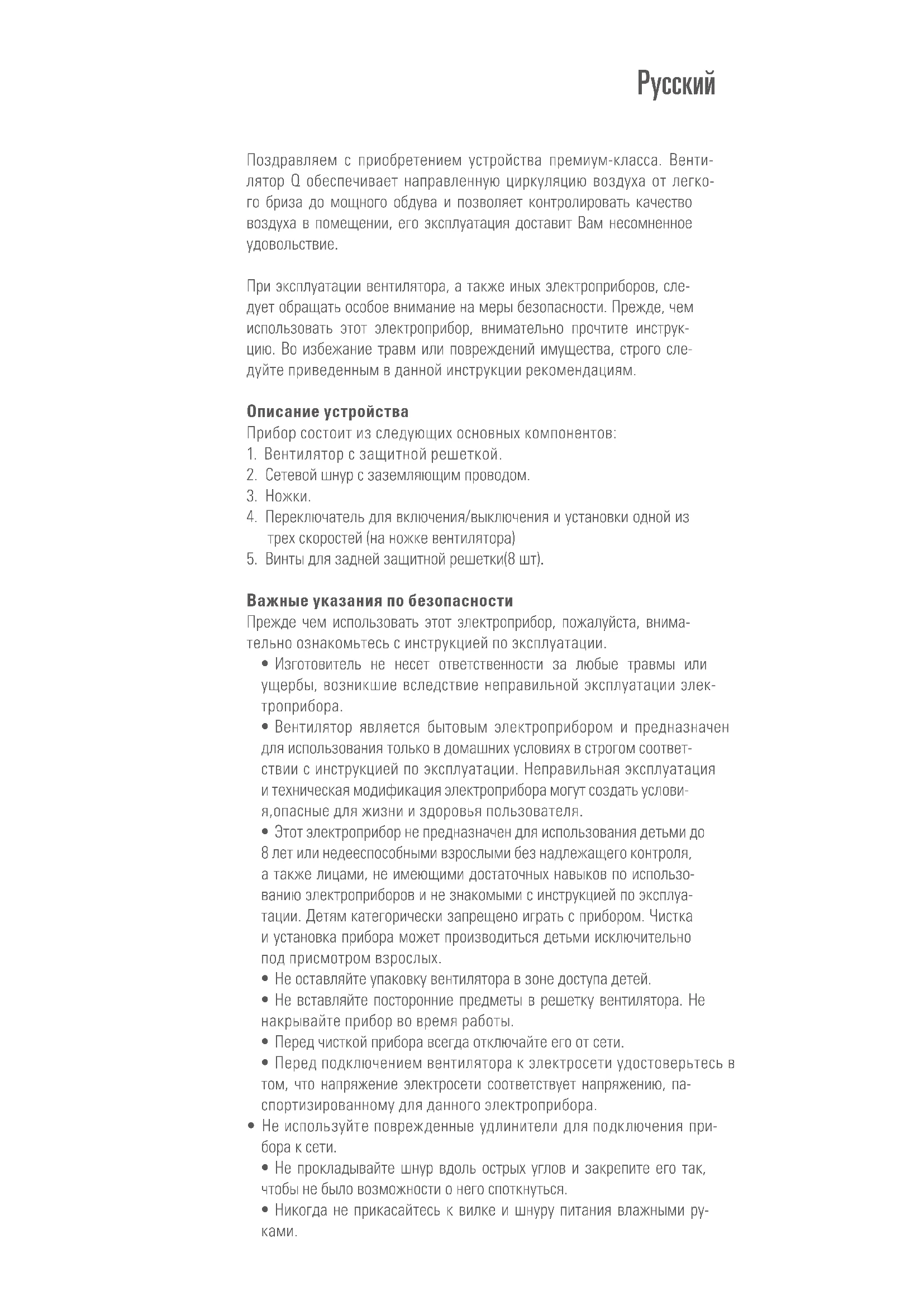 430 x 360 x 150 mm Weight approx. 4.0 kg Speed 3 settings Noise level less than 70dB(A) The right to make technical modifications is reservedПоздравляем с приобретением устройства премиум-класса. Венти- лятор Q обеспечивает направленную циркуляцию воздуха от легко- го бриза до мощного обдува и позволяет контролировать качество воздуха в помещении, его эксплуатация доставит Вам несомненное удовольствие. При эксплуатации вентилятора, а также иных электроприборов, сле- дует обращать особое внимание на меры безопасности. Прежде, чем использовать этот электроприбор, внимательно прочтите инструк- цию. Во избежание травм или повреждений имущества, строго сле- дуйте приведенным в данной инструкции рекомендациям. Описание устройства Прибор состоит из следующих основных компонентов: