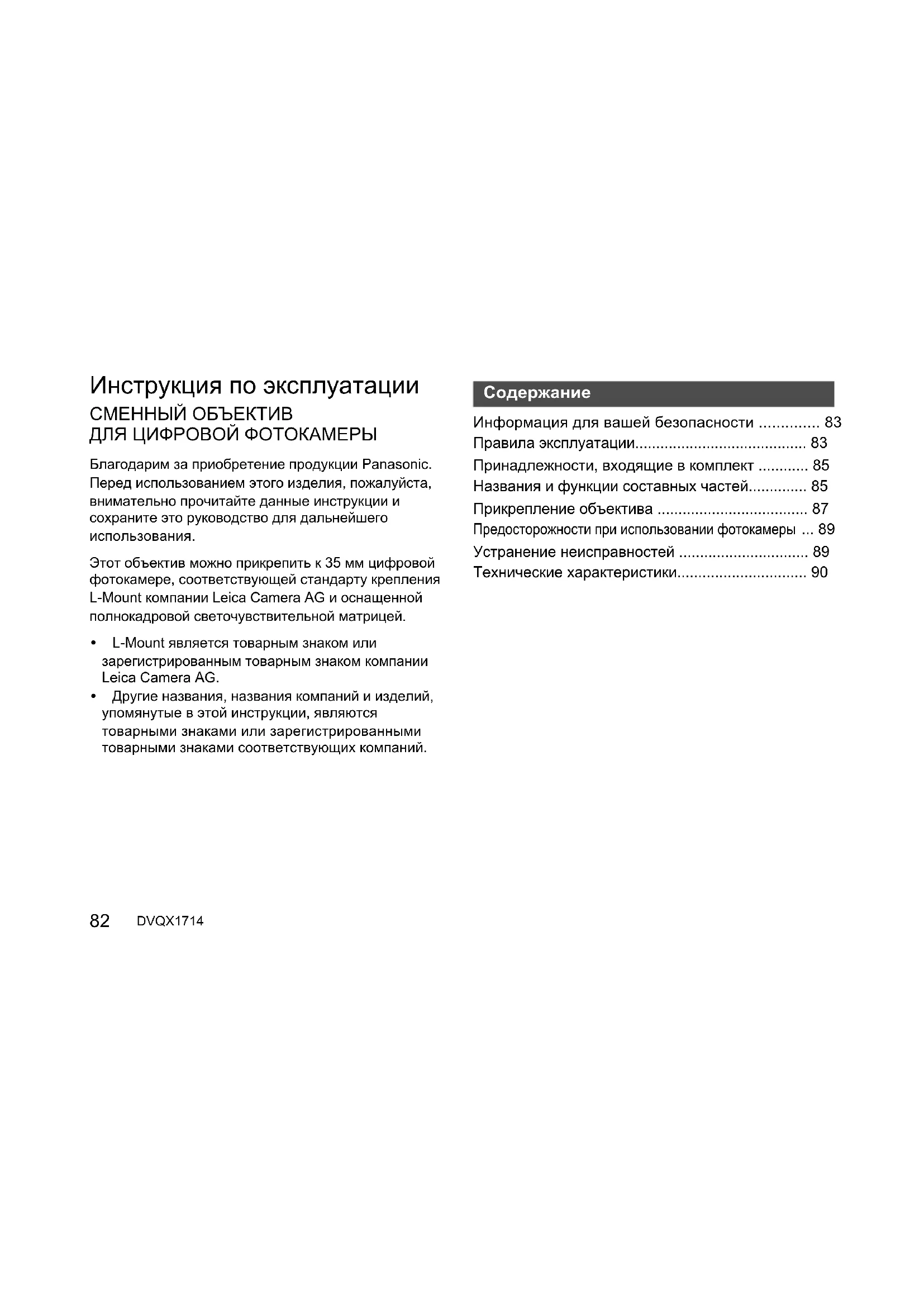 - ḷ߶ԓ˖Q/XMSX 128 S-R24105-DVQX1714ZA.book 81 ページ 2018年12月28日 金曜日 午後3時26分82 DVQX1714 Инструкция по эксплуатации СМЕННЫЙ ОБЪЕКТИВ ДЛЯ ЦИФРОВОЙ ФОТОКАМЕРЫ Благодарим за приобретение продукции Panasonic. Перед использованием этого изделия, пожалуйста, внимательно прочитайте данные инструкции и сохраните это руководство для дальнейшего использования. Этот объектив можно прикрепить к 35 мм цифровой фотокамере, соответствующей стандарту крепления L-Mount компании Leica Camera AG и оснащенной полнокадровой светочувствительной матрицей. 0 L-Mount является товарным знаком или зарегистрированным товарным знаком компании Leica Camera AG. 0 Другие названия, названия компаний и изделий, упомянутые в этой инструкции, являются товарными знаками или зарегистрированными товарными знаками соответствующих компаний. Информация для вашей безопасности p. 83