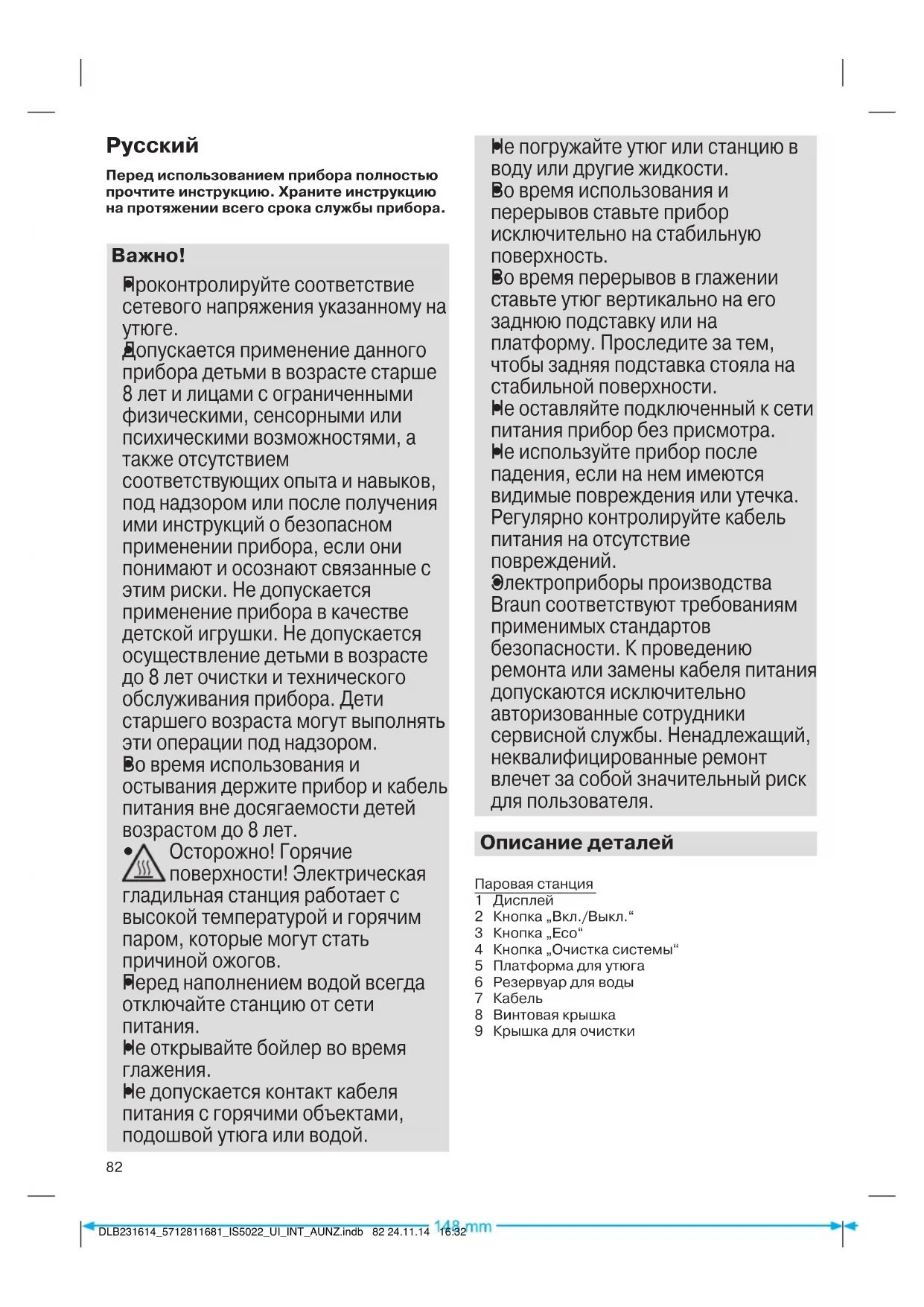 Электроприборы производства Braun соответствуют требованиям применимых стандартов безопасности. К проведению ремонта или замены кабеля питания допускаются исключительно авторизованные сотрудники сервисной службы. Ненадлежащий, неквалифицированные ремонт влечет за собой значительный риск для пользователя. Описание деталей Паровая станция 1 Дисплей 2 Кнопка „Вкл./Выкл.“ 3 Кнопка „Eco“ 4 Кнопка „Очистка системы“ 5 Платформа для утюга 6 Резервуар для воды 7 Кабель 8 Винтовая крышка 9 Крышка для очистки