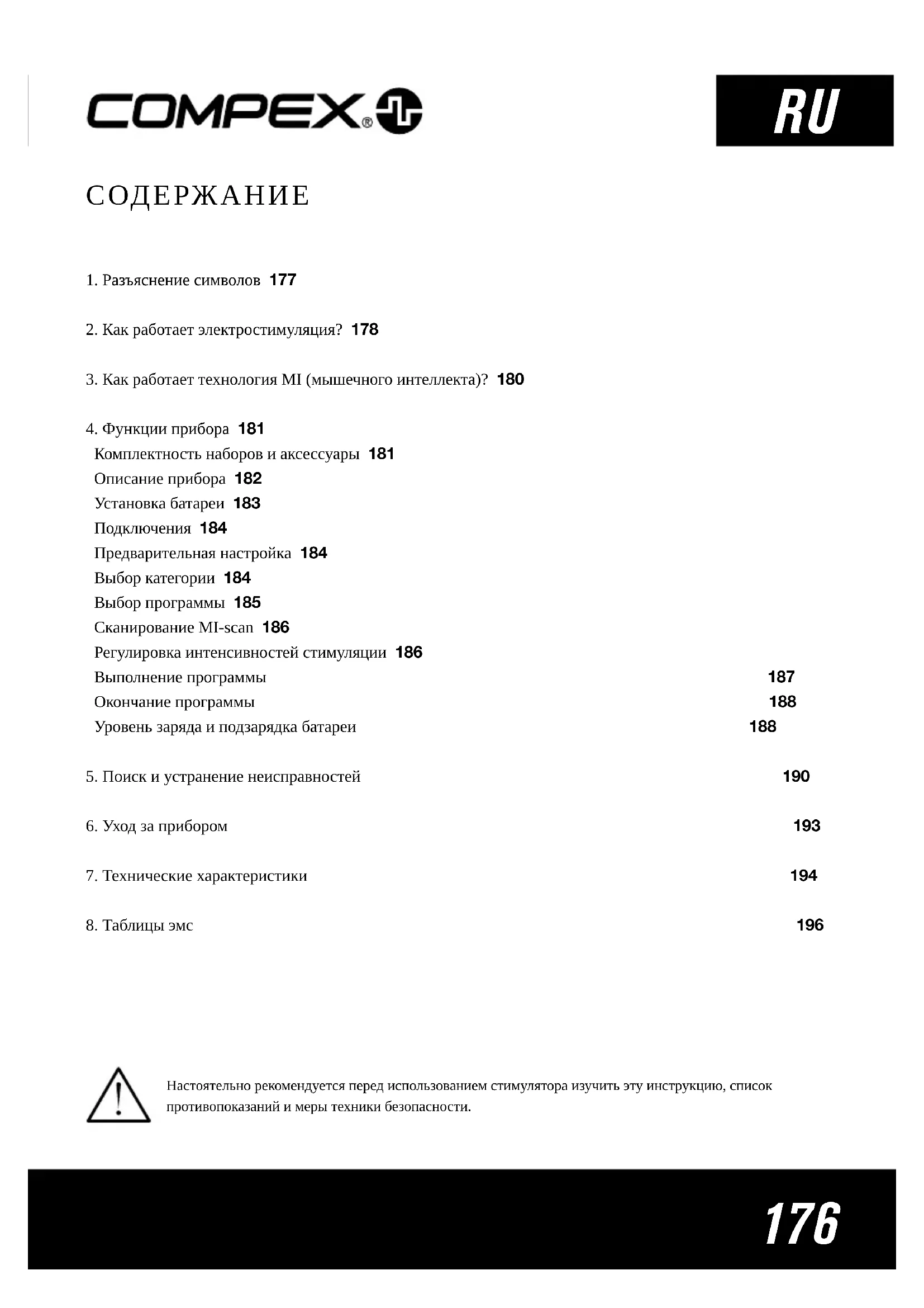 Комплектность наборов и аксессуары 181 Описание прибора 182 Установка батареи 183 Подключения 184 Предварительная настройка 184 Выбор категории 184 Выбор программы 185 Сканирование MI-scan 186 Регулировка интенсивностей стимуляции 186 Выполнение программы 187 Окончание программы 188 Уровень заряда и подзарядка батареи 188