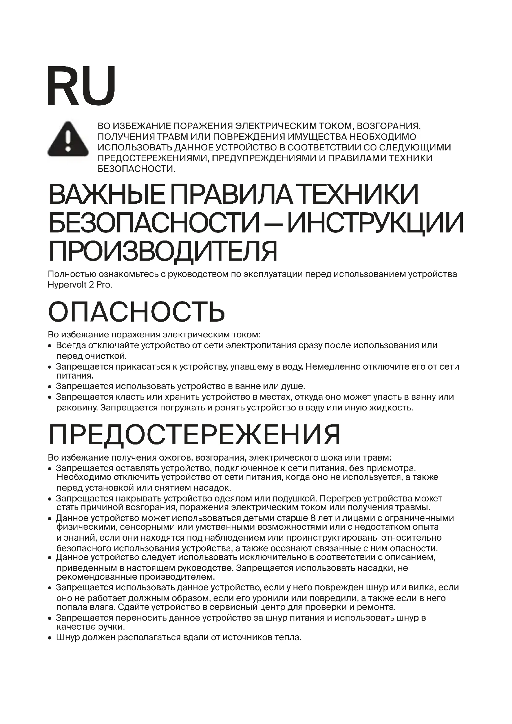 10RU ВО ИЗБЕЖАНИЕ ПОРАЖЕНИЯ ЭЛЕКТРИЧЕСКИМ ТОКОМ, ВОЗГОРАНИЯ, ПОЛУЧЕНИЯ ТРАВМ ИЛИ ПОВРЕЖДЕНИЯ ИМУЩЕСТВА НЕОБХОДИМО ИСПОЛЬЗОВАТЬ ДАННОЕ УСТРОЙСТВО В СООТВЕТСТВИИ СО СЛЕДУЮЩИМИ ПРЕДОСТЕРЕЖЕНИЯМИ, ПРЕДУПРЕЖДЕНИЯМИ И ПРАВИЛАМИ ТЕХНИКИ БЕЗОПАСНОСТИ. ВАЖНЫЕ ПРАВИЛА ТЕХНИКИ БЕЗОПАСНОСТИ — ИНСТРУКЦИИ ПРОИЗВОДИТЕЛЯ Полностью ознакомьтесь с руководством по эксплуатации перед использованием устройства Hypervolt2Pro.
