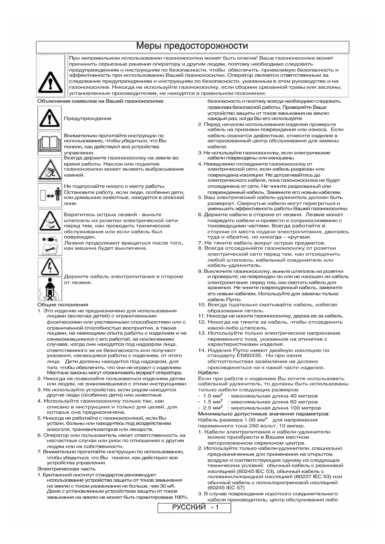 Atsarginės dalys Geležtė330 Nuorodos numeris: FLY007350 Nuorodos numeris: FLY008400 Nuorodos numeris: FLY048Dalies numeris: 511835790Dalies numeris: 512733490Dalies numeris: 511864790Меры предосторожности При неправильном использовании газонокосилка может быть опасна! Ваша газонокосилка может причинить серьезные ранения оператору и другим людям, поэтому необходимо следовать предупреждениям и инструкциям по безопасности, чтобы обеспечить приемлемую безопасность и эффективность при использовании Вашей газонокосилки. Оператор является ответственным за следование предупреждениям и инструкциям по безопасности, указанным в этом руководстве и на газонокосилке. Никогда не используйте газонокосилку, если сборник срезанной травы или заслоны, установленные производителем, не находятся в правильном положении. Объяснение символов на Вашей газонокосилке Предупреждение Внимательно прочитайте инструкции по использованию, чтобы убедиться, что Вы поняли, как действуют все устройства управления. Всегда держите газонокосилку на земле во время работы. Наклон или поднятие газонокосилки может вызвать выбрасывание