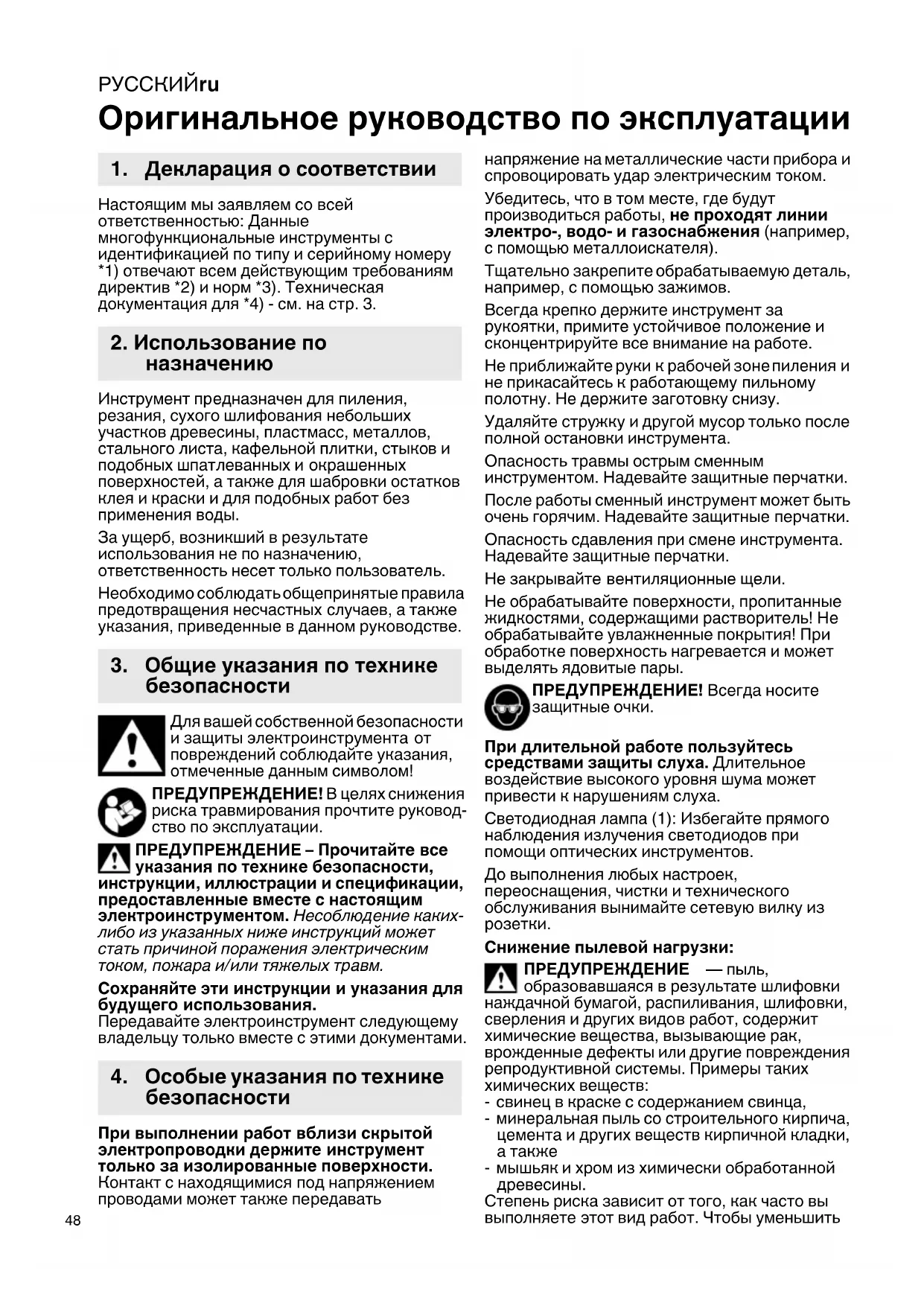 Оригинальное руководство по эксплуатации Настоящим мы заявляем со всей ответственностью: Данные многофункциональные инструменты с идентификацией по типу и серийному номеру *1) отвечают всем действующим требованиям директив *2) и норм *3). Техническая документация для *4) - см. на стр. 3. Инструмент предназначен для пиления, резания, сухого шлифования небольших участков древесины, пластмасс, металлов, стального листа, кафельной плитки, стыков и подобных шпатлеванных и