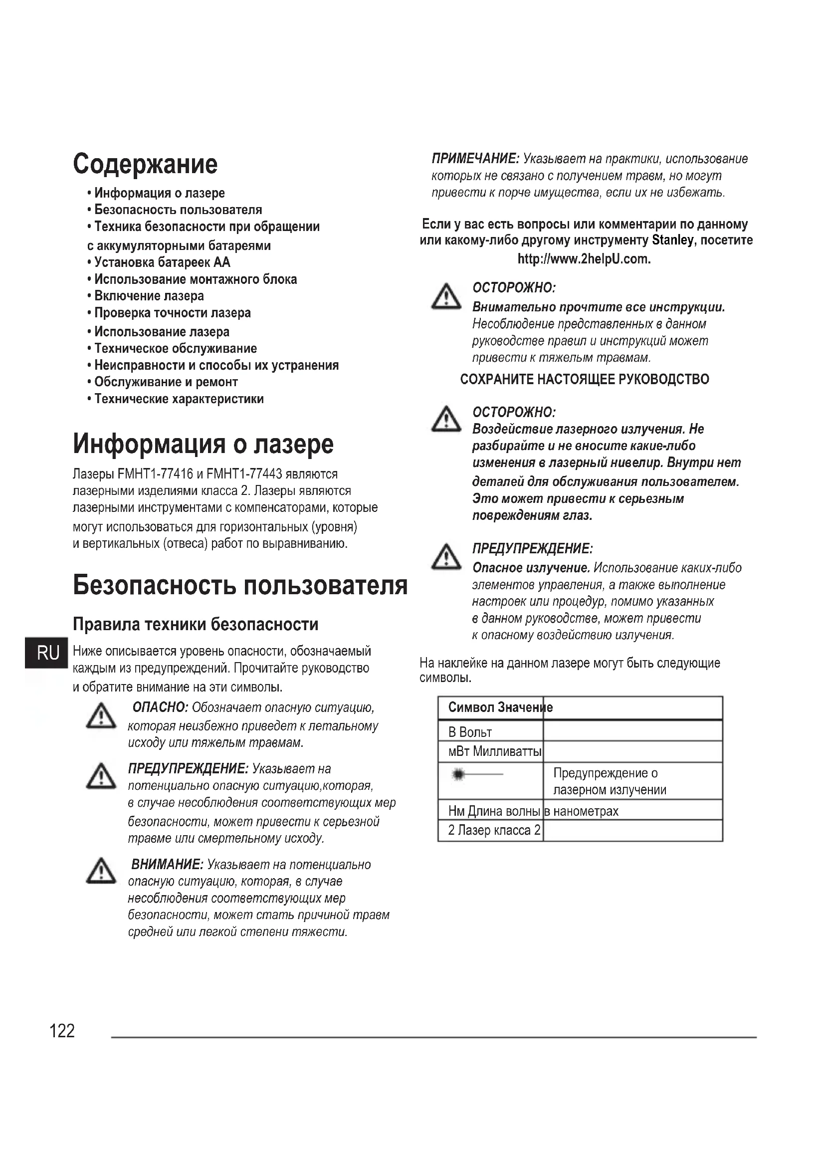 - Технические характеристики Информация о лазере Лазеры FMHT1-77416 и FMHT1-77443 являются лазерными изделиями класса 2. Лазеры являются лазерными инструментами с компенсаторами, которые могут использоваться для горизонтальных (уровня) и вертикальных (отвеса) работ по выравниванию. Безопасность пользователя Правила техники безопасности Ниже описывается уровень опасности, обозначаемый каждым из предупреждений. Прочитайте руководство и обратите внимание на эти символы. ОПАСНО: Обозначает опасную ситуацию, которая неизбежно приведет к летальному исходу или тяжелым травмам. ПРЕДУПРЕЖДЕНИЕ: Указывает на потенциально опасную ситуацию,которая, в случае несоблюдения соответствующих мер безопасности, может привести к серьезной травме или смертельному исходу. ВНИМАНИЕ: Указывает на потенциально опасную ситуацию, которая, в случае несоблюдения соответствующих мер безопасности, может стать причиной травм средней или легкой степени тяжести. ПРИМЕЧАНИЕ: Указывает на практики, использование которых не связано с получением травм, но могут привести к порче имущества, если их не избежать. Если у вас есть вопросы или комментарии по данному или какому-либо другому инструменту Stanley, посетите http://www.2helpU.com.