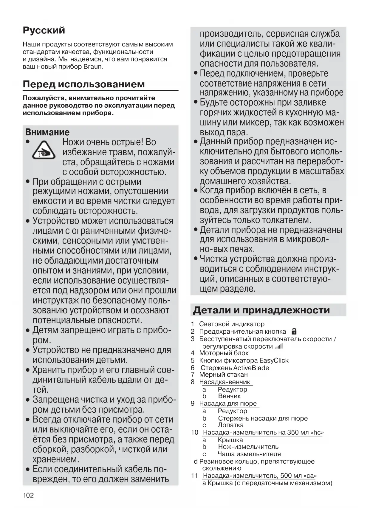 Чистка устройства должна произ- водиться с соблюдением инструк- ций, описанных в соответствую- щем разделе. Детали и принадлежности 1 Световой индикатор 2 Предохранительная кнопка 3 Бесступенчатый переключатель скорости / регулировка скорости 4 Моторный блок 5 Кнопки фиксатора EasyClick 6 Стержень ActiveBlade 7 Мерный стакан 8 Насадка-венчик a Редуктор b Венчик 9 Насадка для пюре a Редуктор b Стержень насадки для пюре c Лопатка 10 Насадка-измельчитель на 350 мл «hc» a Крышка b Нож-измельчитель c Чаша измельчителя d Резиновое кольцо, препятствующее