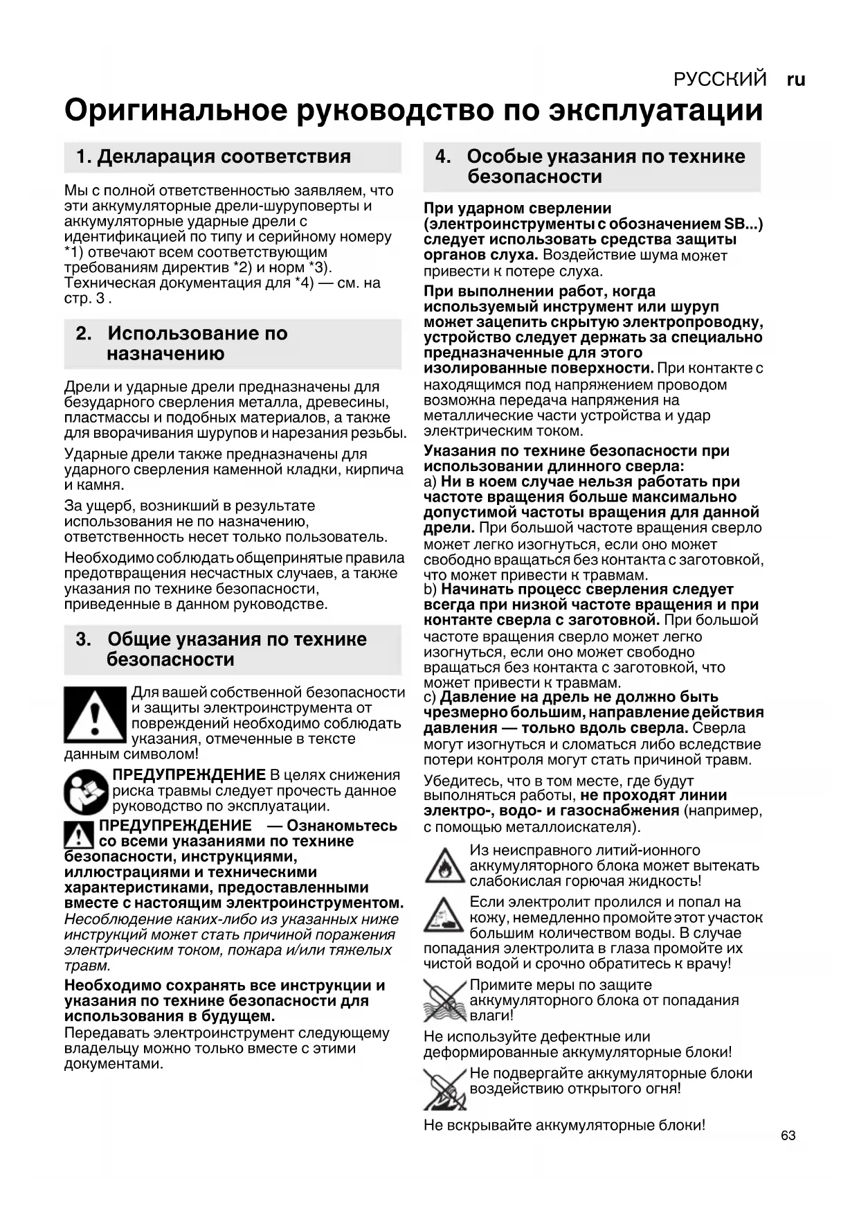 Оригинальное руководство по эксплуатации Мы с полной ответственностью заявляем, что эти аккумуляторные дрели-шуруповерты и аккумуляторные ударные дрели с идентификацией по типу и серийному номеру *1) отвечают всем соответствующим требованиям директив *2) и норм *3). Техническая документация для *4) — см. на стр.3. Дрели и ударные дрели предназначены для безударного сверления металла, древесины, пластмассы и подобных материалов, а также для вворачивания шурупов и нарезания резьбы. Ударные дрели также предназначены для ударного сверления каменной кладки, кирпича