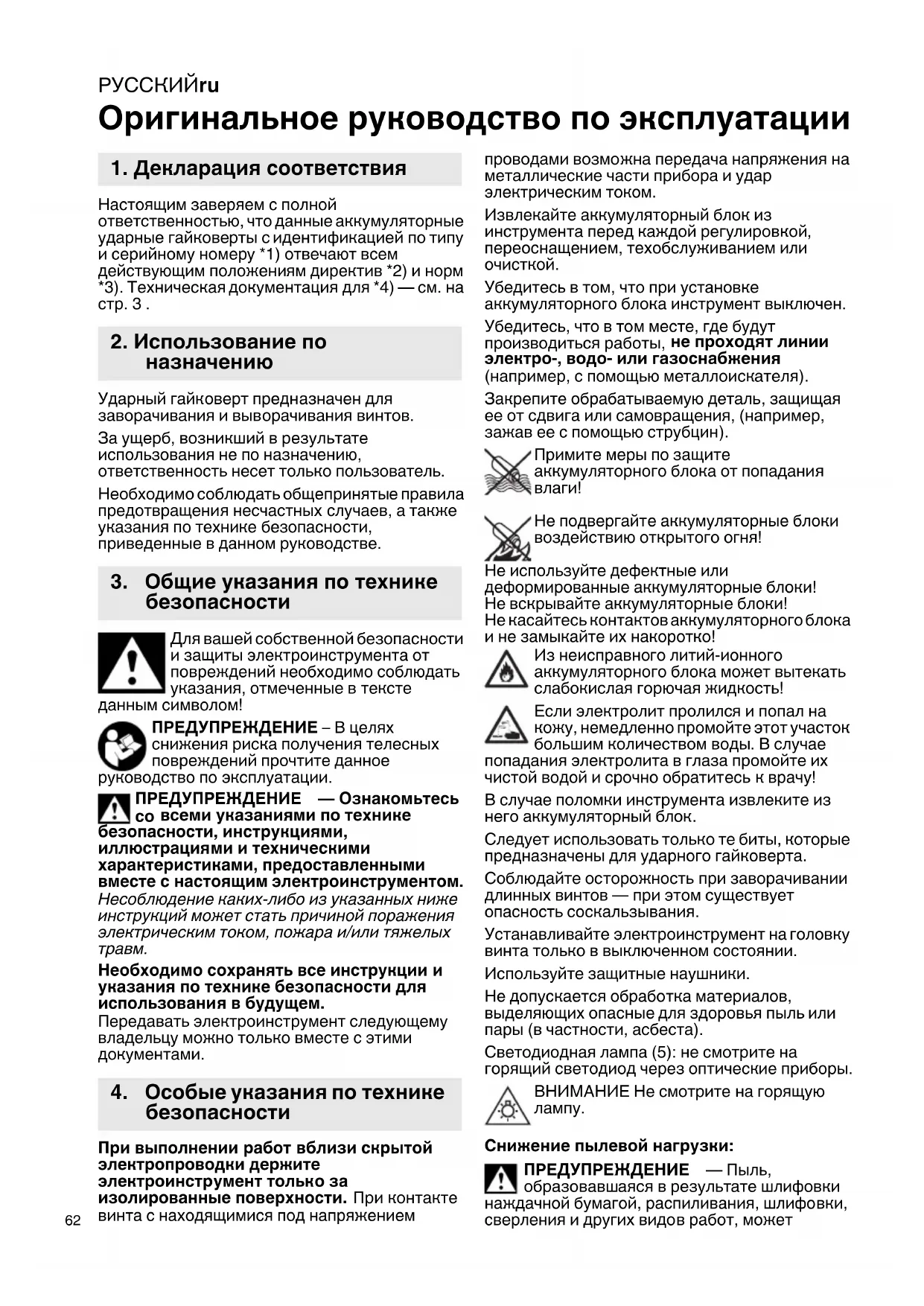 Оригинальное руководство по эксплуатации Настоящим заверяем с полной ответственностью, что данные аккумуляторные ударные гайковерты с идентификацией по типу и серийному номеру *1) отвечают всем действующим положениям директив *2) и норм *3). Техническая документация для *4) — см. на стр.3. Ударный гайковерт предназначен для заворачивания и выворачивания винтов. За ущерб, возникший в результате использования не по назначению, ответственность несет только пользователь. Необходимо соблюдать общепринятые правила предотвращения несчастных случаев, а также указания по технике безопасности, приведенные в данном руководстве. Для вашей собственной безопасности и защиты электроинструмента от повреждений необходимо соблюдать указания, отмеченные в тексте данным символом! ПРЕДУПРЕЖДЕНИЕ – В целях снижения риска получения телесных повреждений прочтите данное руководство по эксплуатации. ПРЕДУПРЕЖДЕНИЕ — Ознакомьтесь