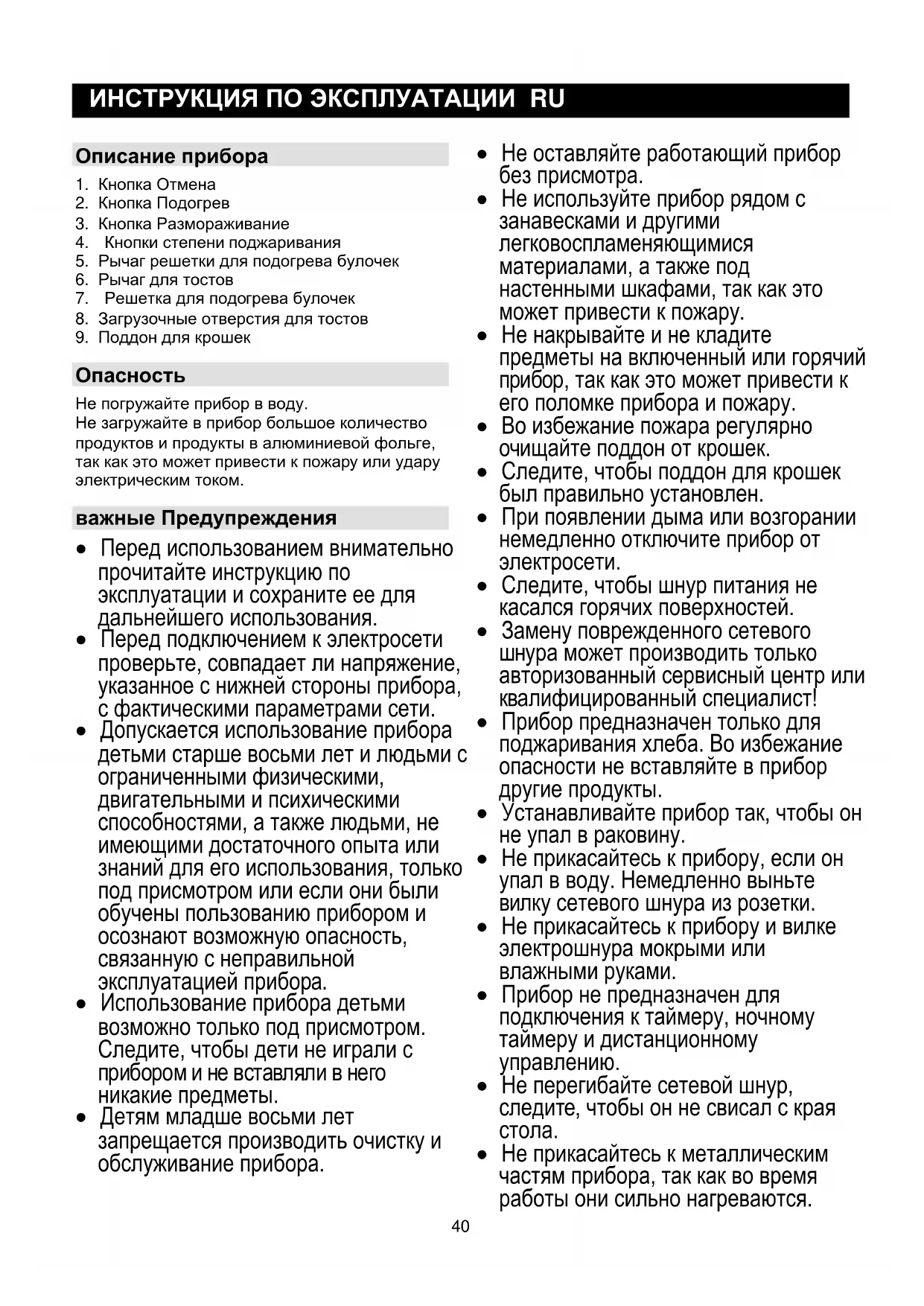 - Прибор предназначен только для поджаривания хлеба. Во избежание опасности не вставляйте в прибор другие продукты.