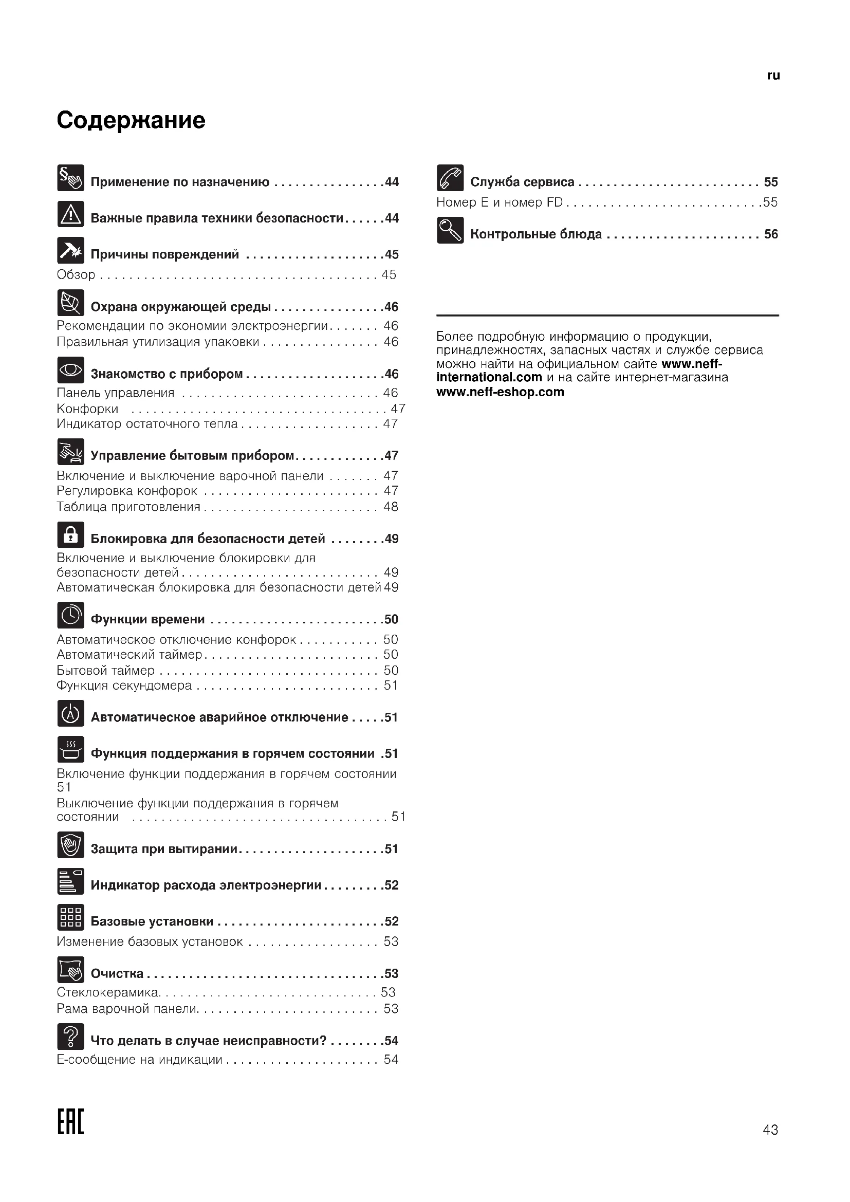 - E Контрольные блюда Produktinfo Более подробную информацию о продукции, принадлежностях, запасных частях и службе сервиса можно найти на официальном сайте www.neff- international.com и на сайте интернет-магазина www.neff-eshop.comru Применение по назначению p. 56