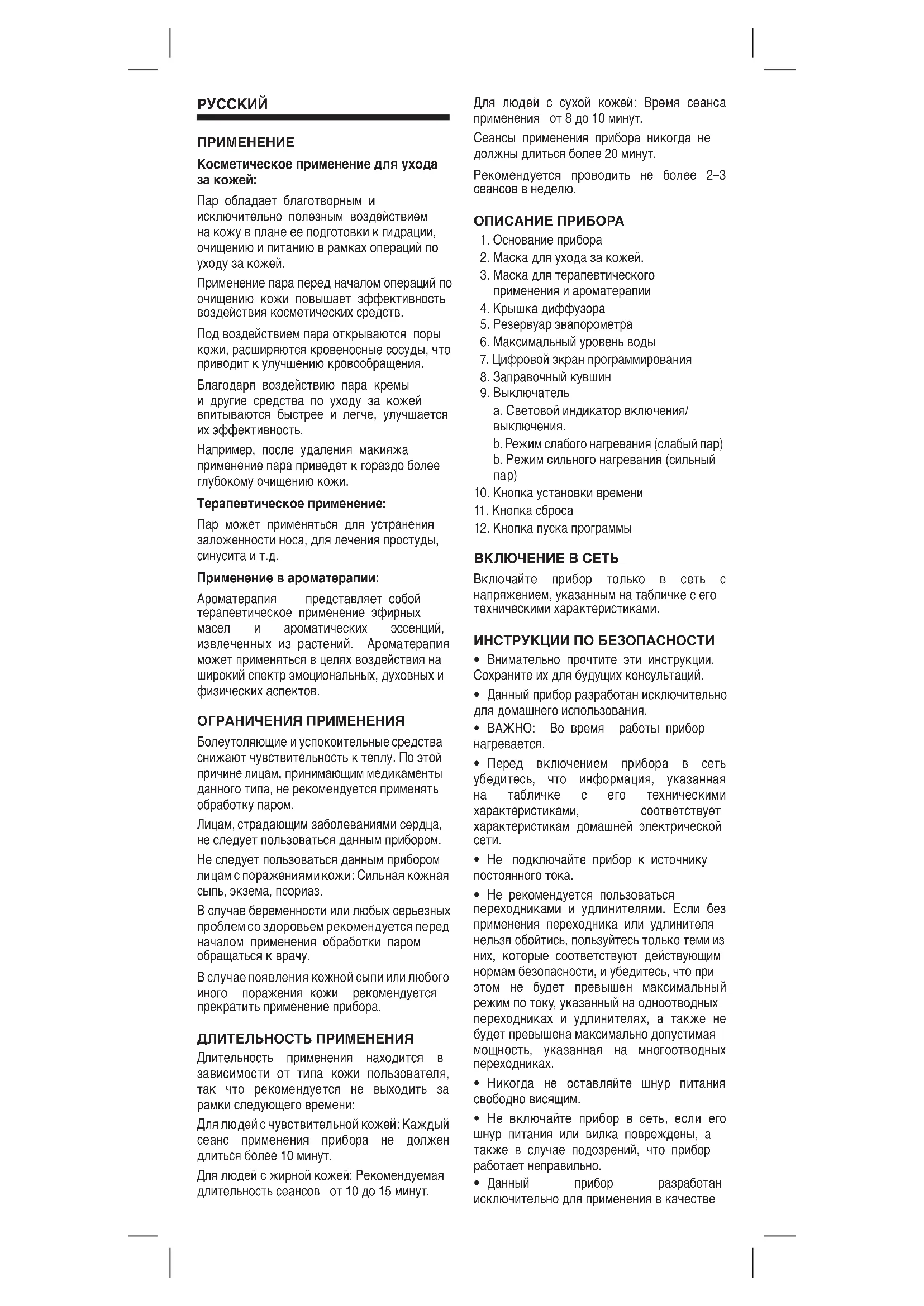 Пар обладает благотворным и исключительно полезным воздействием на кожу в плане ее подготовки к гидрации, очищению и питанию в рамках операций по уходу за кожей. Применение пара перед началом операций по очищению кожи повышает эффективность воздействия косметических средств. Под воздействием пара открываются поры кожи, расширяются кровеносные сосуды, что приводит к улучшению кровообращения. Благодаря воздействию пара кремы и другие средства по уходу за кожей впитываются быстрее и легче, улучшается их эффективность. Например, после удаления макияжа применение пара приведет к гораздо более глубокому очищению кожи. Терапевтическое применение: Пар может применяться для устранения заложенности носа, для лечения простуды, синусита и т.д. Применение в ароматерапии: Ароматерапия представляет собой терапевтическое применение эфирных масел и ароматических эссенций, извлеченных из растений. Ароматерапия может применяться в целях воздействия на широкий спектр эмоциональных, духовных и физических аспектов. ОГРАНИЧЕНИЯ ПРИМЕНЕНИЯ Болеутоляющие и успокоительные средства снижают чувствительность к теплу. По этой причине лицам, принимающим медикаменты данного типа, не рекомендуется применять обработку паром. Лицам, страдающим заболеваниями сердца, не следует пользоваться данным прибором. Не следует пользоваться данным прибором лицам с поражениями кожи: Сильная кожная сыпь, экзема, псориаз. В случае беременности или любых серьезных проблем со здоровьем рекомендуется перед началом применения обработки паром обращаться к врачу. В случае появления кожной сыпи или любого иного поражения кожи рекомендуется прекратить применение прибора. ДЛИТЕЛЬНОСТЬ ПРИМЕНЕНИЯ Длительность применения находится в зависимости от типа кожи пользователя, так что рекомендуется не выходить за рамки следующего времени: Для людей с чувствительной кожей: Каждый сеанс применения прибора не должен длиться более 10 минут. Для людей с жирной кожей: Рекомендуемая длительность сеансов ― от 10 до 15 минут. Для людей с сухой кожей: Время сеанса применения ― от 8 до 10 минут. Сеансы применения прибора никогда не должны длиться более 20 минут. Рекомендуется проводить не более 2–3 сеансов в неделю. ОПИСАНИЕ ПРИБОРА