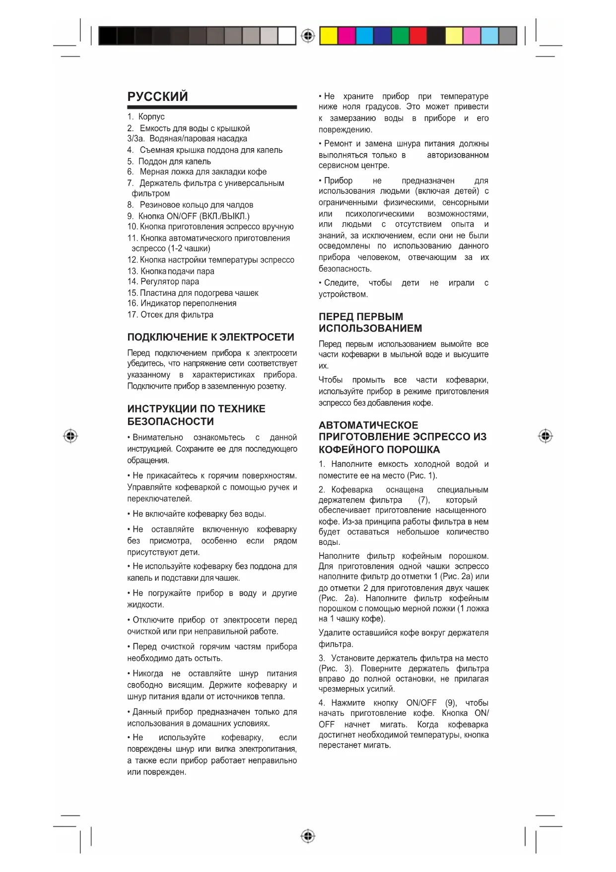 (3) и нажмите кнопку приготовления эспрессо вручную (10). Затем поверните регулятор пара (14) для подачи горячей воды из паровой насадки. ЧИСТКА И УХОД Перед чисткой кофеварки убедитесь, что прибор отключен от электросети и остыл. Съемные детали можно промыть в мыльной воде. Не погружайте кофеварку в воду или другую жидкость. Периодически очищайте гнездо держателя фильтра для удаления на нем остатков