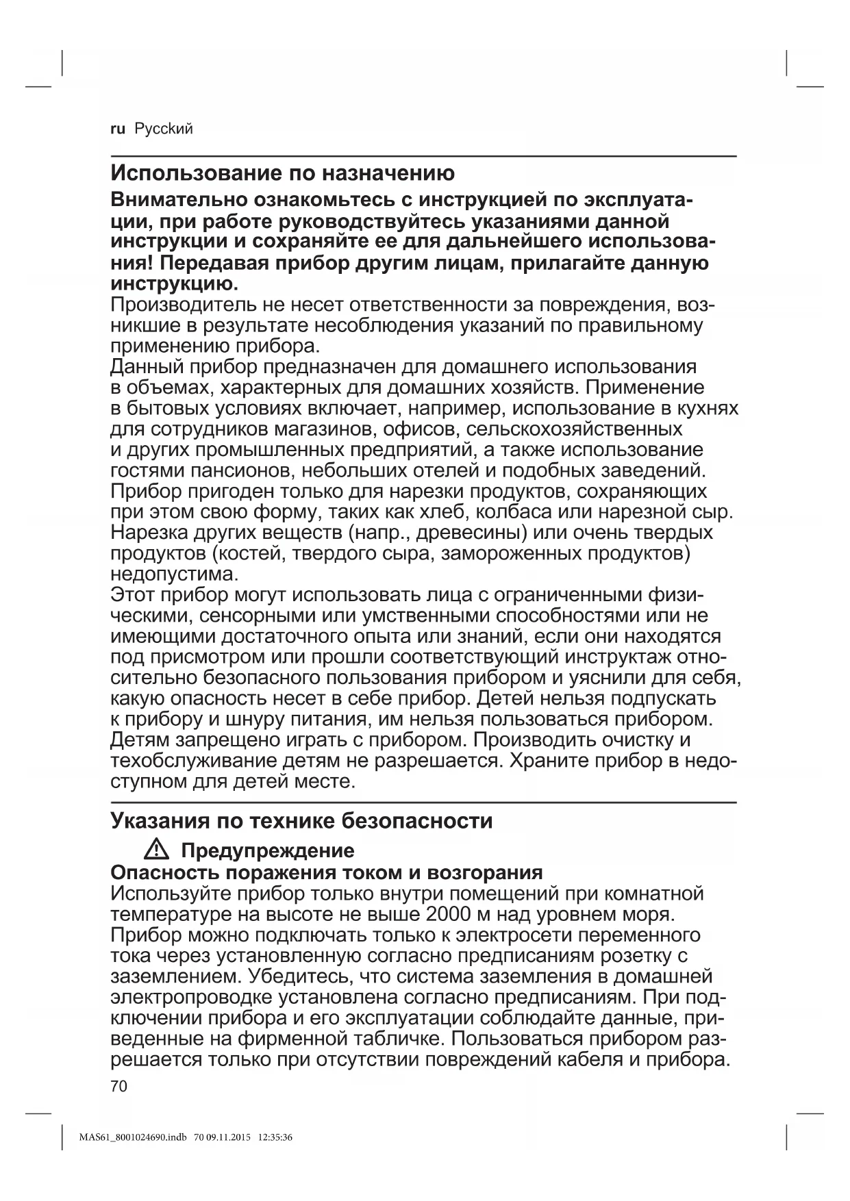 Можливізміни. MAS61_8001024690.indb 69 09.11.2015 12:35:3670 ru Pycckий Использование по назначению Внимательно ознакомьтесь с инструкцией по эксплуата- ции, при работе руководствуйтесь указаниями данной инструкции и сохраняйте ее для дальнейшего использова- ния! Передавая прибор другим лицам, прилагайте данную инструкцию. Производительненесетответственностизаповреждения,воз- никшиеврезультатенесоблюденияуказанийпоправильному применениюприбора. Данныйприборпредназначендлядомашнегоиспользования вобъемах,характерныхдлядомашниххозяйств.Применение вбытовыхусловияхвключает,например,использованиевкухнях длясотрудниковмагазинов,офисов,сельскохозяйственных идругихпромышленныхпредприятий,атакжеиспользование гостямипансионов,небольшихотелейиподобныхзаведений. Приборпригодентолькодлянарезкипродуктов,сохраняющих приэтомсвоюформу,такихкакхлеб,колбасаилинарезнойсыр. Нарезкадругихвеществ(напр.,древесины)илиоченьтвердых продуктов(костей,твердогосыра,замороженныxпродуктoв) недопустима. Этотприбормогутиспользоватьлицасограниченнымифизи- ческими,сенсорнымиилиумственнымиспособностямиилине имеющимидостаточногоопытаилизнаний,еслионинаходятся подприсмотромилипрошлисоответствующийинструктажотно- сительнобезопасногопользованияприборомиуяснилидлясебя, какуюопасностьнесетвсебеприбор.Детейнельзяподпускать кприборуишнурупитания,имнельзяпользоватьсяприбором. Детямзапрещеноигратьсприбором.Производитьочисткуи техобслуживаниедетямнеразрешается.Хранитеприборвнедо- ступномдлядетейместе. Указания по технике безопасности W Предупреждение Опасность поражения током и возгорания Используйтеприбортольковнутрипомещенийприкомнатной температуренавысотеневыше2000мнадуровнемморя. Приборможноподключатьтолькокэлектросетипеременного токачерезустановленнуюсогласнопредписаниямрозеткус заземлением.Убедитесь,чтосистемазаземлениявдомашней электропроводкеустановленасогласнопредписаниям.Припод- ключенииприбораиегоэксплуатациисоблюдайтеданные,при- веденныенафирменнойтабличке.Пользоватьсяприборомраз- решаетсятолькоприотсутствииповрежденийкабеляиприбора. MAS61_8001024690.indb 70 09.11.2015 12:35:36 71