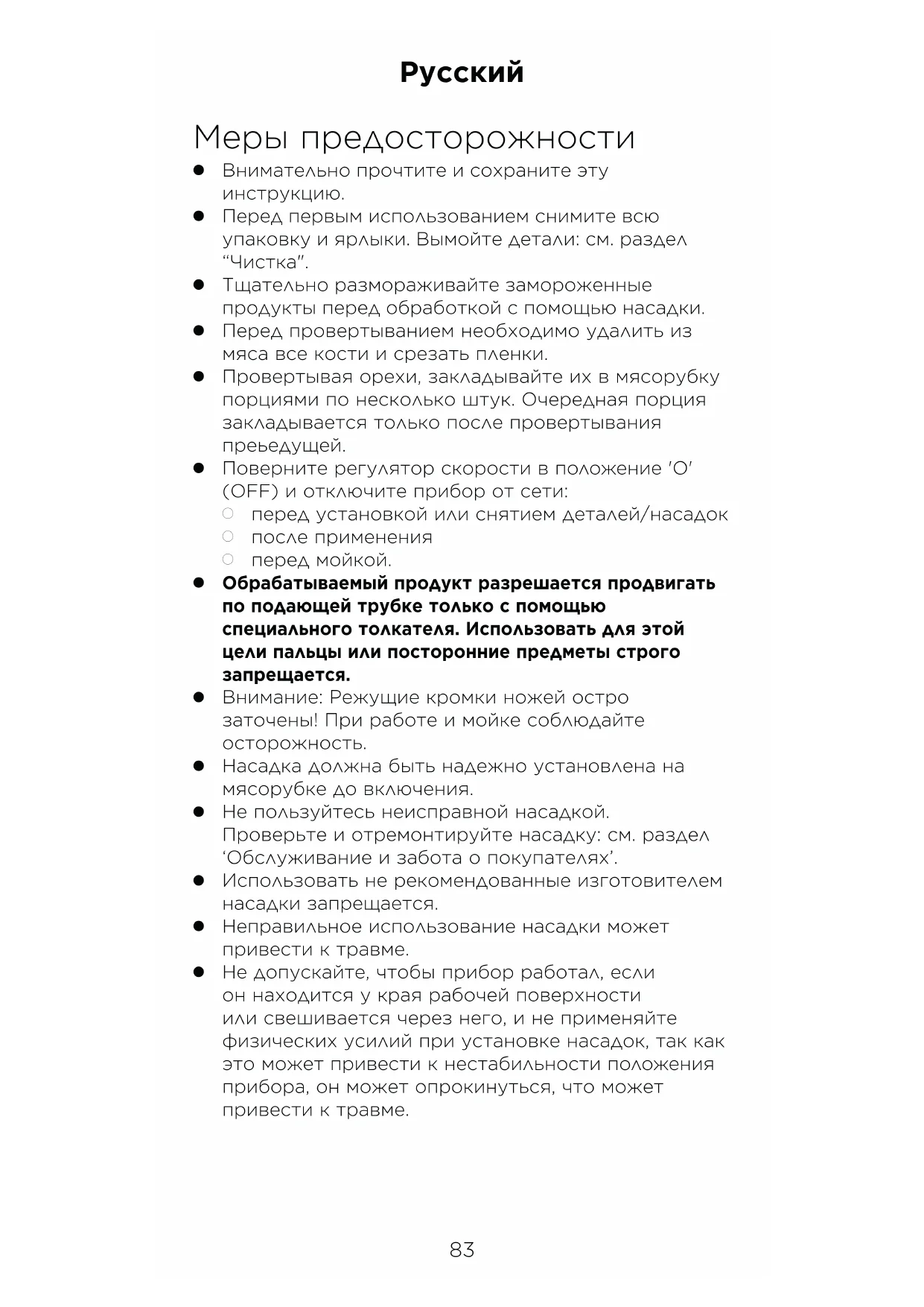 Wyprodukowano w Chinach.83 Меры предосторожности Внимательно прочтите и сохраните эту инструкцию. Перед первым использованием снимите всю упаковку и ярлыки. Вымойте детали: см. раздел