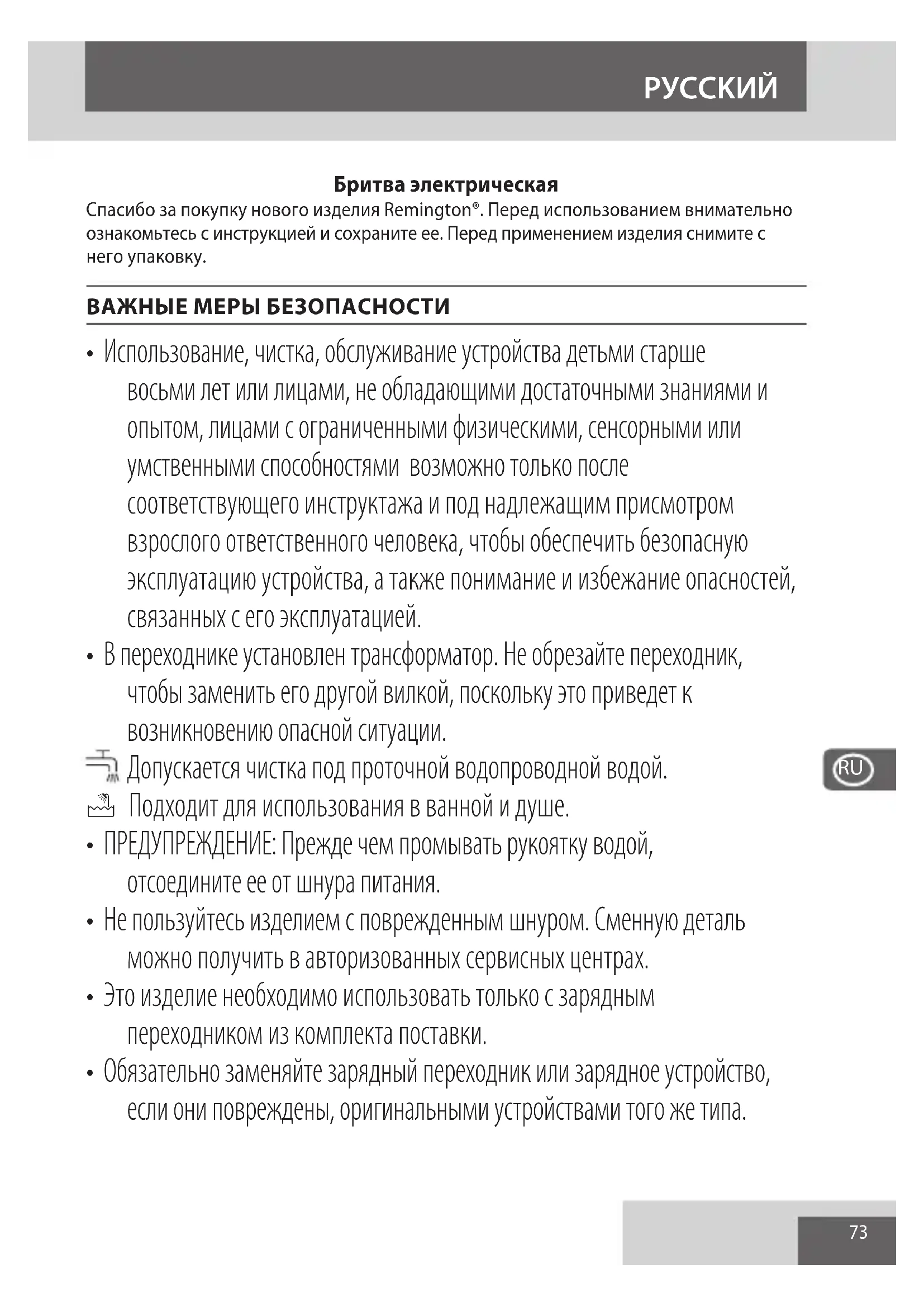 Бритва электрическая Спасибо за покупку нового изделия Remington®. Перед использованием внимательно ознакомьтесь с инструкцией и сохраните ее. Перед применением изделия снимите с него упаковку. ВАЖНЫЕ МЕРЫ БЕЗОПАСНОСТИ