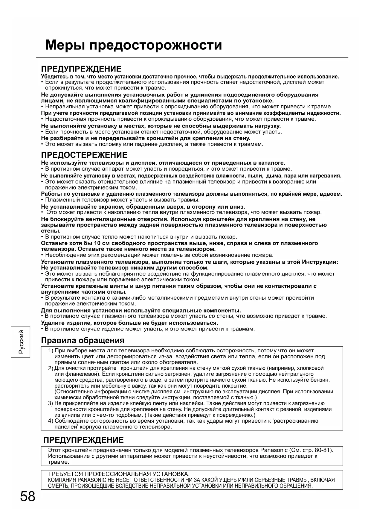 ТРЕБУЕТСЯ ПРОФЕССИОНАЛЬНАЯ УСТАНОВКА. КОМПАНИЯ PANASONIC НЕ НЕСЕТ ОТВЕТСТВЕННОСТИ НИ ЗА КАКОЙ УЩЕРБ И/ИЛИ СЕРЬЕЗНЫЕ ТРАВМЫ, ВКЛЮЧАЯ СМЕРТЬ, ПРОИЗОШЕДШИЕ ВСЛЕДСТВИЕ НЕПРАВИЛЬНОЙ УСТАНОВКИ ИЛИ НЕПРАВИЛЬНОГО ОБРАЩЕНИЯ. Меры предосторожности59