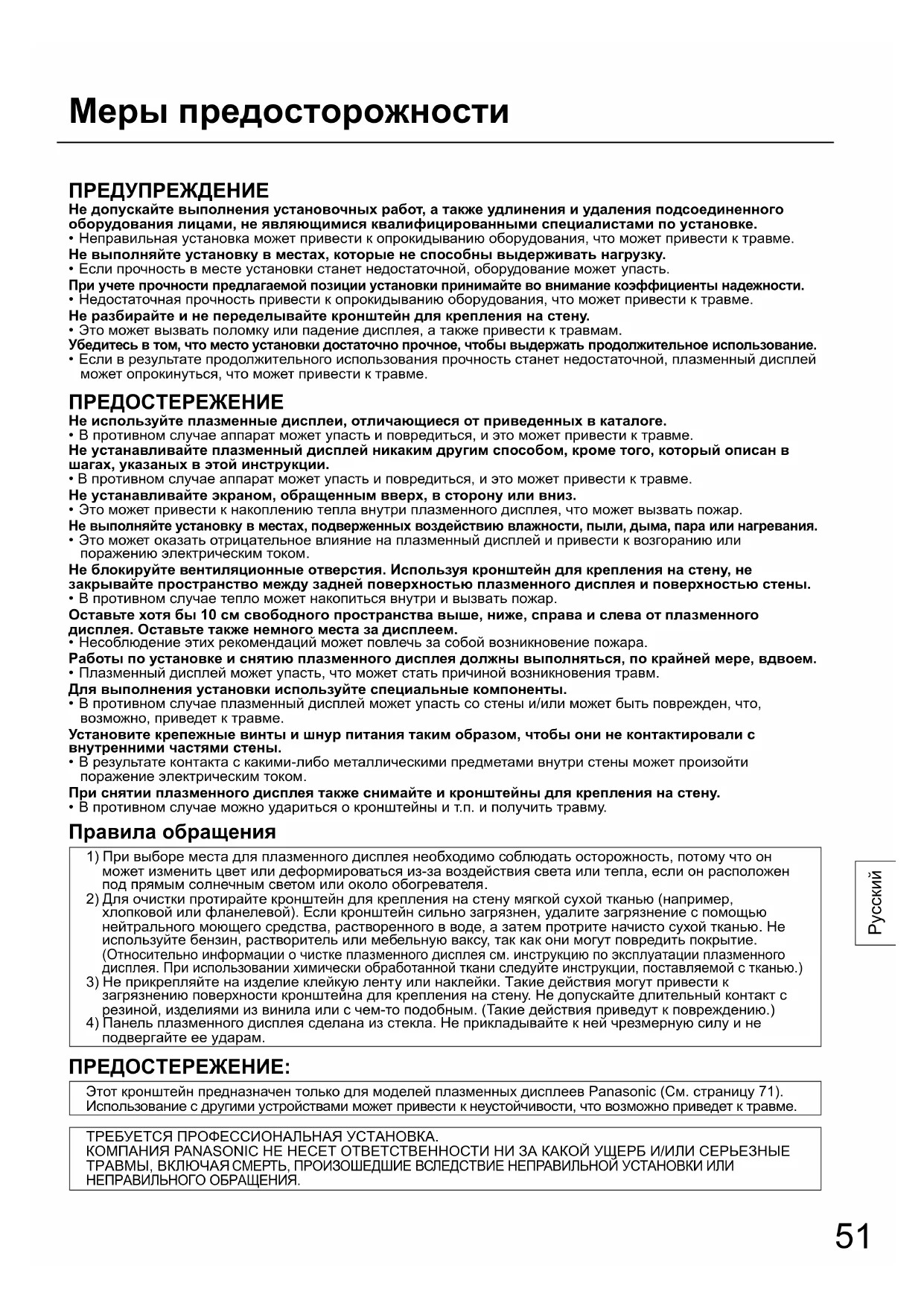 подвергайте ее ударам. ПРЕДОСТЕРЕЖЕНИЕ: Этот кронштейн предназначен только для моделей плазменных дисплеев Panasonic (См. страницу 71). Использование с другими устройствами может привести к неустойчивости, что возможно приведет к травме. ТРЕБУЕТСЯ ПРОФЕССИОНАЛЬНАЯ УСТАНОВКА. КОМПАНИЯ PANASONIC НЕ НЕСЕТ ОТВЕТСТВЕННОСТИ НИ ЗА КАКОЙ УЩЕРБ И/ИЛИ СЕРЬЕЗНЫЕ ТРАВМЫ, ВКЛЮЧАЯ СМЕРТЬ, ПРОИЗОШЕДШИЕ ВСЛЕДСТВИЕ НЕПРАВИЛЬНОЙ УСТАНОВКИ ИЛИ НЕПРАВИЛЬНОГО ОБРАЩЕНИЯ.52