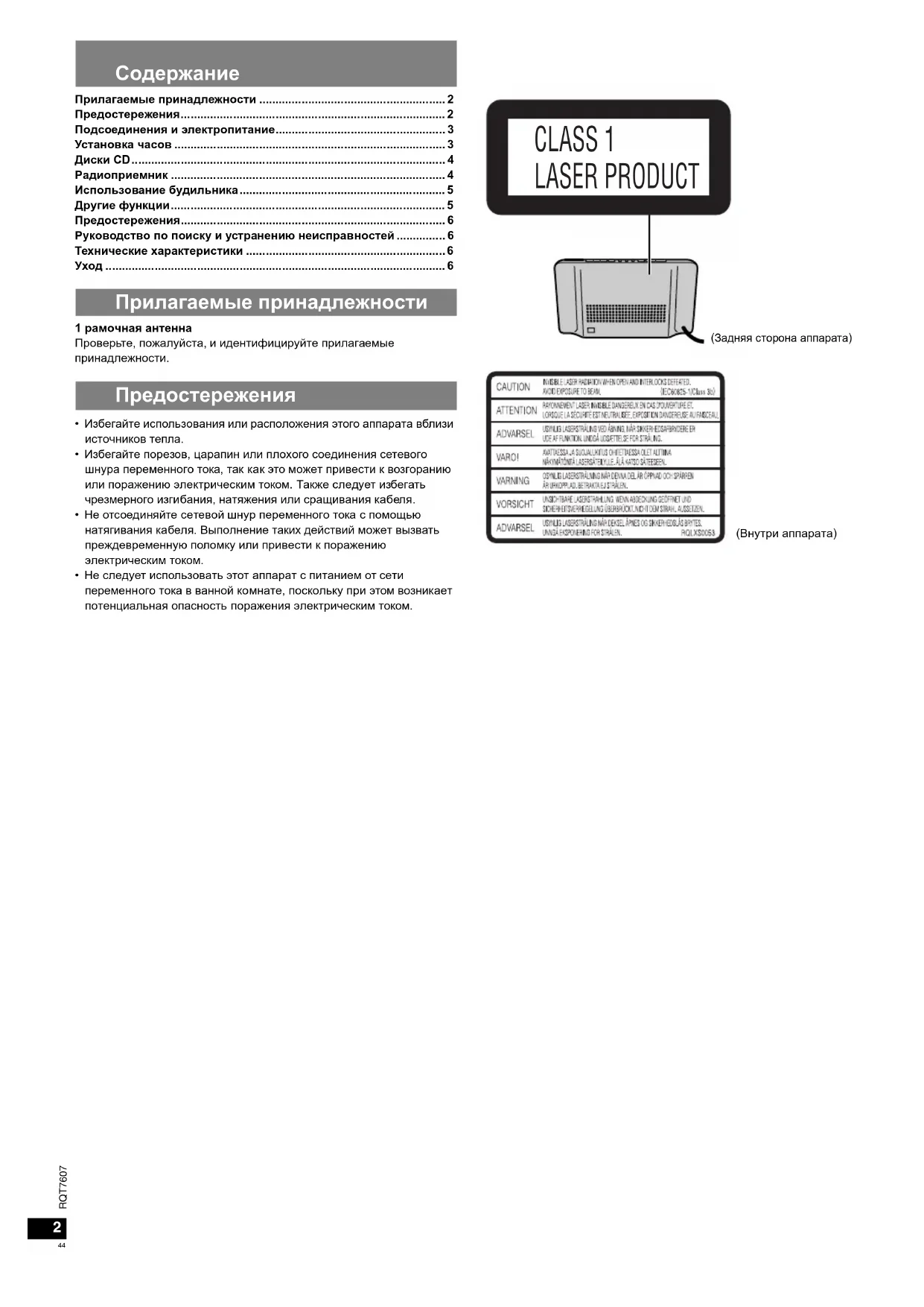Прилагаемые принадлежности Предостережения (Внутри аппарата) CLASS 1 LASER PRODUCT (Задняя сторона аппарата) 2РУССКИЙ ЯЗЫК RQT7607