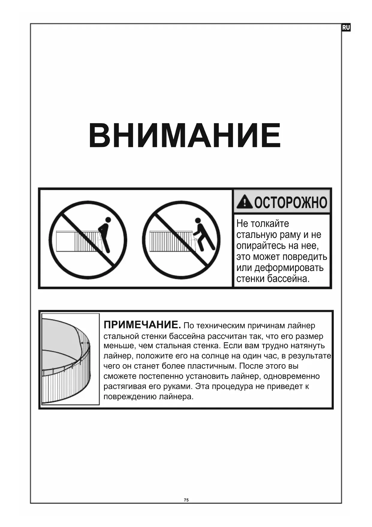 10 εκατ. #04 #0875 Не толкайте стальную раму и не опирайтесь на нее, это может повредить или деформировать стенки бассейна. ПРИМЕЧАНИЕ. По техническим причинам лайнер стальной стенки бассейна рассчитан так, что его размер меньше, чем стальная стенка. Если вам трудно натянуть лайнер, положите его на солнце на один час, в результате чего он станет более пластичным. После этого вы сможете постепенно установить лайнер, одновременно растягивая его руками. Эта процедура не приведет к повреждению лайнера.