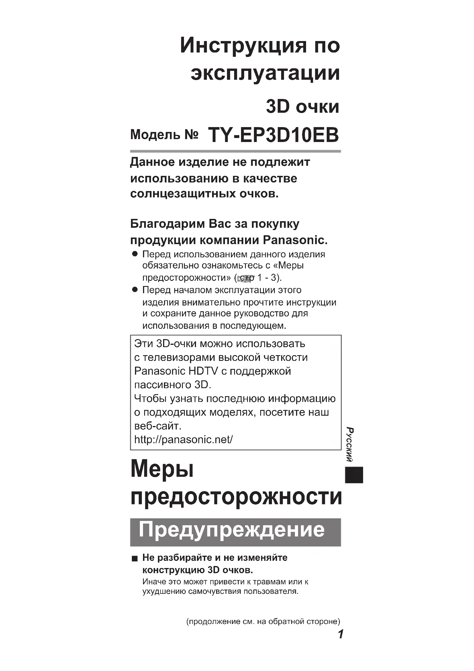 Перед началом эксплуатации этого изделия внимательно прочтите инструкции и сохраните данное руководство для использования в последующем.Эти 3D-очки можно использовать с телевизорами высокой четкости Panasonic HDTV с поддержкой пассивного 3D.Чтобы узнать последнюю информацию о подходящих моделях, посетите наш веб-сайт.http://panasonic.net/