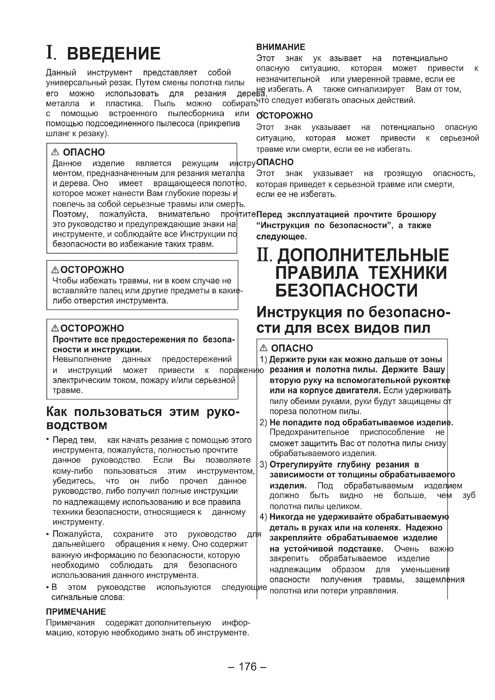 Передтем, какначатьрезаниеспомощьюэтогоинструмента,пожалуйста,полностьюпрочтитеданное руководство. Если Вы позволяетекому-либо пользоваться этим инструментом,убедитесь, что он либо прочел данноеруководство,либополучилполныеинструкциипонадлежащемуиспользованиюивсеправилатехникибезопасности,относящиесяк данномуинструменту. Пожалуйста, сохраните это руководство длядальнейшего обращениякнему.Оносодержитважнуюинформациюпобезопасности,которуюнеобходимо соблюдать для безопасногоиспользованияданногоинструмента. В этом руководстве используются следующиесигнальныеслова:ПРИМЕЧАНИЕПримечания содержатдополнительную инфор-мацию,которуюнеобходимознатьобинструменте.ВНИМАНИЕЭтот знак ук азывает на потенциальноопасную ситуацию, которая может привести кнезначительной илиумереннойтравме,еслиеенеизбегать.А такжесигнализирует Вамоттом,чтоследуетизбегатьопасныхдействий.ОСТОРОЖНОЭтот знак указывает на потенциально опаснуюситуацию, которая может привести к серьезнойтравмеилисмерти,еслиеенеизбегать.ОПАСНОЭтот знак указывает на грозящую опасность,котораяприведетксерьезнойтравмеилисмерти,еслиеенеизбегать.Перед эксплуатацией прочтите брошюру “Инструкция по безопасности”, а также следующее.