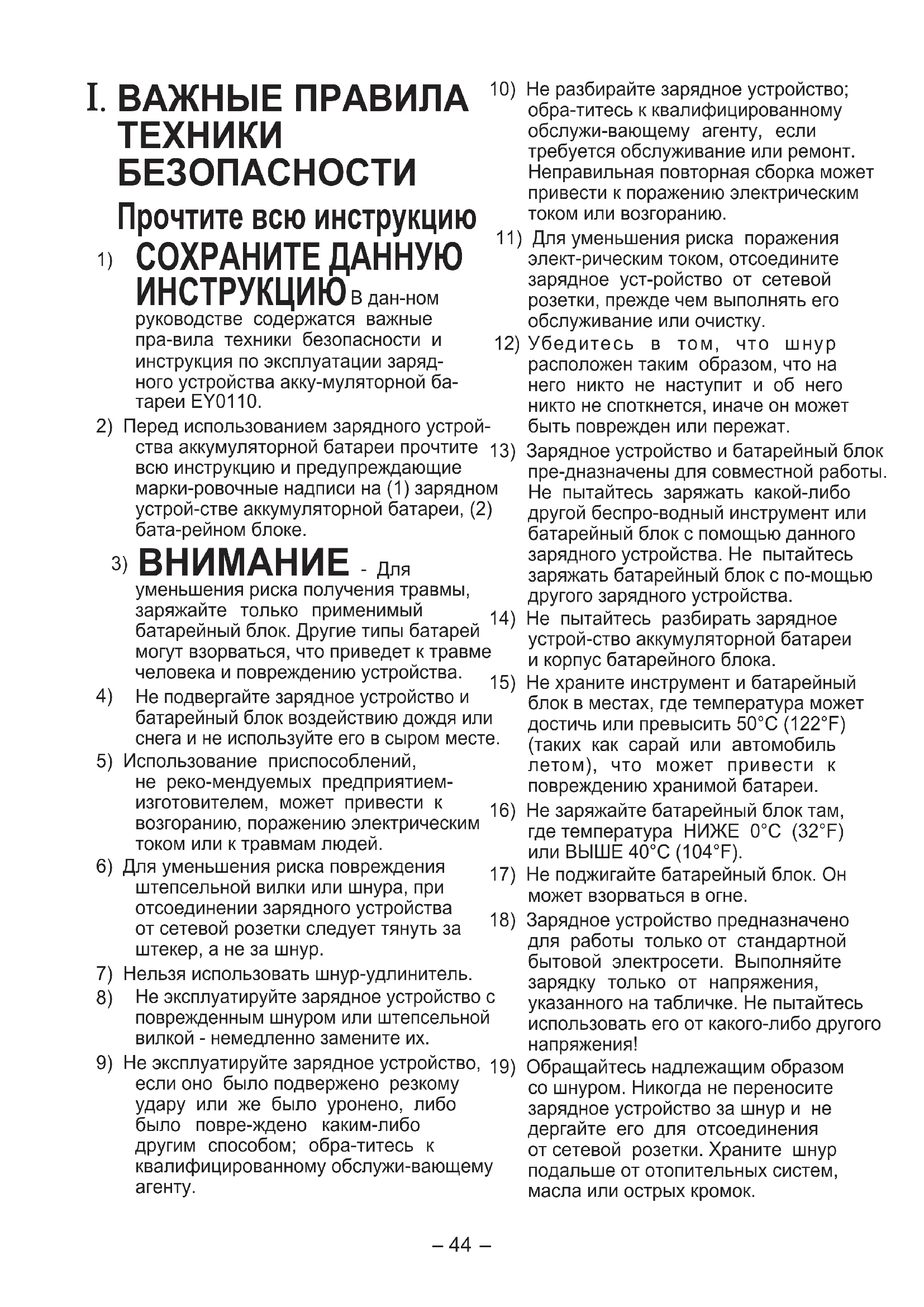 - В дан-ном руководстве содержатся важные пра-вила техники безопасности и инструкция по эксплуатации заряд- ного устройства акку-муляторной ба- тареи EY0110.