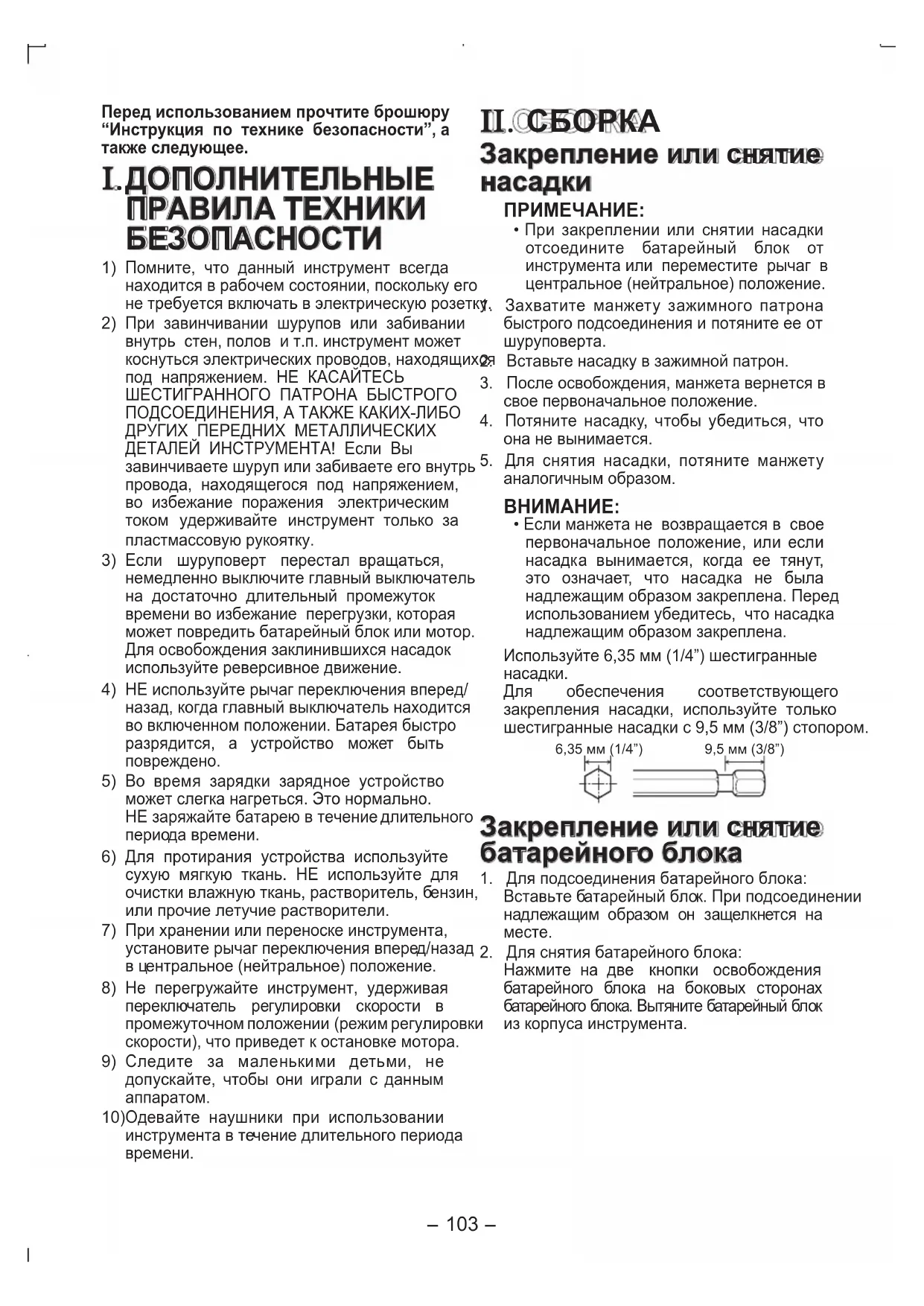 Помните, что данный инструмент всегда находится в рабочем состоянии, поскольку его не требуется включать в электрическую розетку. При завинчивании шурупов или забивании внутрь стен, полов и т.п. инструмент может коснуться электрических проводов, находящихся под напряжением. НЕ КАСАЙТЕСЬ ШЕСТИГРАННОГО ПАТРОНА БЫСТРОГО ПОДСОЕДИНЕНИЯ, А ТАКЖЕ КАКИХ-ЛИБО ДРУГИХ ПЕРЕДНИХ МЕТАЛЛИЧЕСКИХ ДЕТАЛЕЙ ИНСТРУМЕНТА! Если Вы завинчиваете шуруп или забиваете его внутрь провода, находящегося под напряжением, во избежание поражения электрическим током удерживайте инструмент только за пластмассовую рукоятку. Если шуруповерт перестал вращаться, немедленно выключите главный выключатель на достаточно длительный промежуток времени во избежание перегрузки, которая может повредить батарейный блок или мотор.Для освобождения заклинившихся насадок используйте реверсивное движение. НЕ используйте рычаг переключения вперед/назад, когда главный выключатель находится во включенном положении. Батарея быстро разрядится, а устройство может быть повреждено.