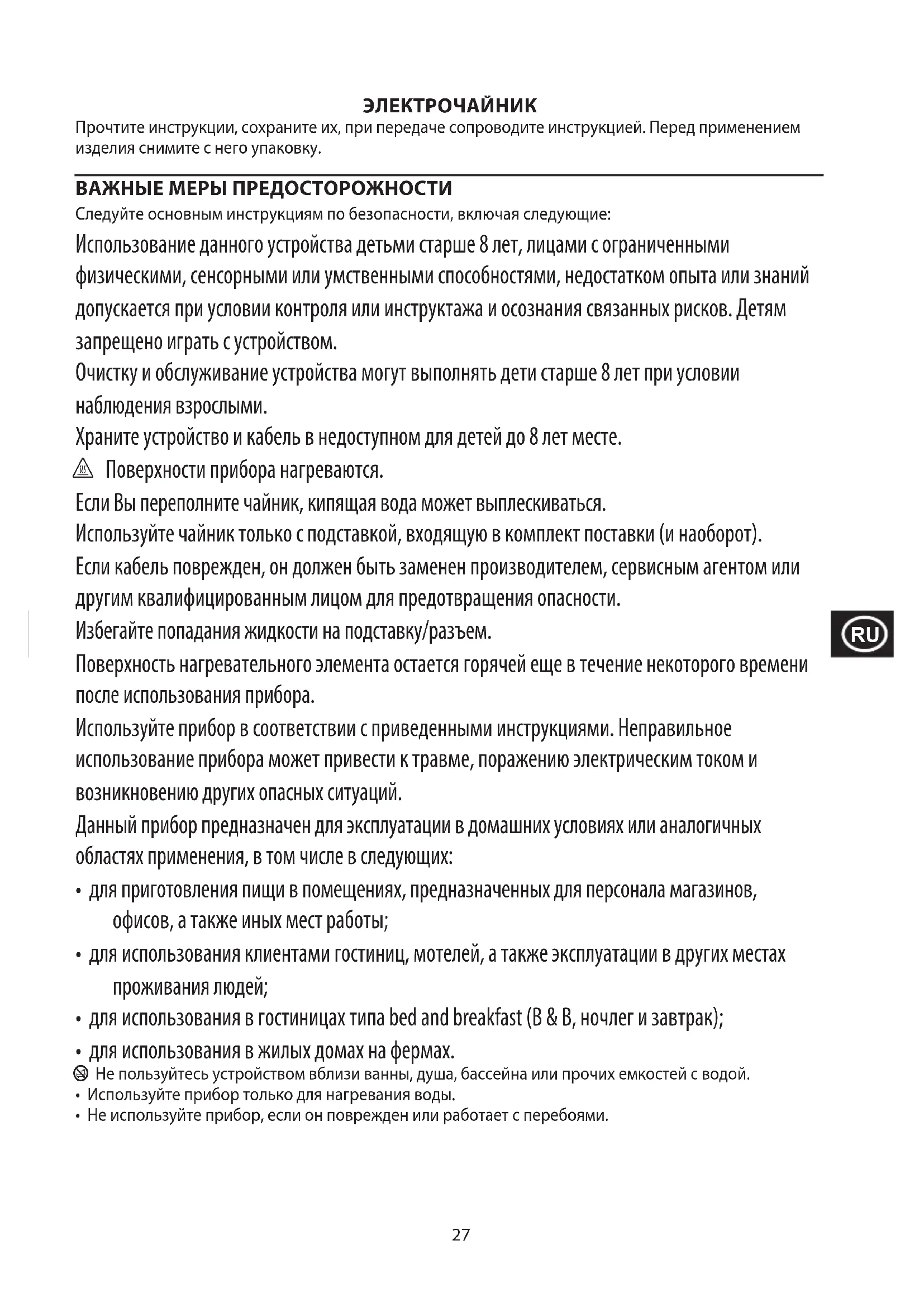 Jotta vältettäisiin vaarallisista aineista ympäristölle ja terveydelle koituvat haitat, näillä symboleilla varustettuja laitteita sekä ladattavia ja kertakäyttöisiä paristoja ei saa hävittää lajittelemattomana sekajätteenä. Hävitä sähkö- ja elektroniikkatuotteet sekä, mikäli sovellettavissa, ladattavat ja kertakäyttöiset paristot asianmukaiseen viralliseen kierrätys-/keräilypisteeseen.27 ЭЛЕКТРОЧАЙНИК Прочтите инструкции, сохраните их, при передаче сопроводите инструкцией. Перед применением изделия снимите с него упаковку. ВАЖНЫЕ МЕРЫ ПРЕДОСТОРОЖНОСТИ Следуйте основным инструкциям по безопасности, включая следующие: Использование данного устройства детьми старше 8 лет, лицами с ограниченными физическими, сенсорными или умственными способностями, недостатком опыта или знаний допускается при условии контроля или инструктажа и осознания связанных рисков. Детям запрещено играть с устройством. Очистку и обслуживание устройства могут выполнять дети старше 8 лет при условии наблюдения взрослыми. Храните устройство и кабель в недоступном для детей до 8 лет месте. h Поверхности прибора нагреваются. Если Вы переполните чайник, кипящая вода может выплескиваться. Используйте чайник только с подставкой, входящую в комплект поставки (и наоборот). Если кабель поврежден, он должен быть заменен производителем, сервисным агентом или другим квалифицированным лицом для предотвращения опасности. Избегайте попадания жидкости на подставку/разъем. Поверхность нагревательного элемента остается горячей еще в течение некоторого времени после использования прибора. Используйте прибор в соответствии с приведенными инструкциями. Неправильное использование прибора может привести к травме, поражению электрическим током и возникновению других опасных ситуаций. Данный прибор предназначен для эксплуатации в домашних условиях или аналогичных областях применения, в том числе в следующих: