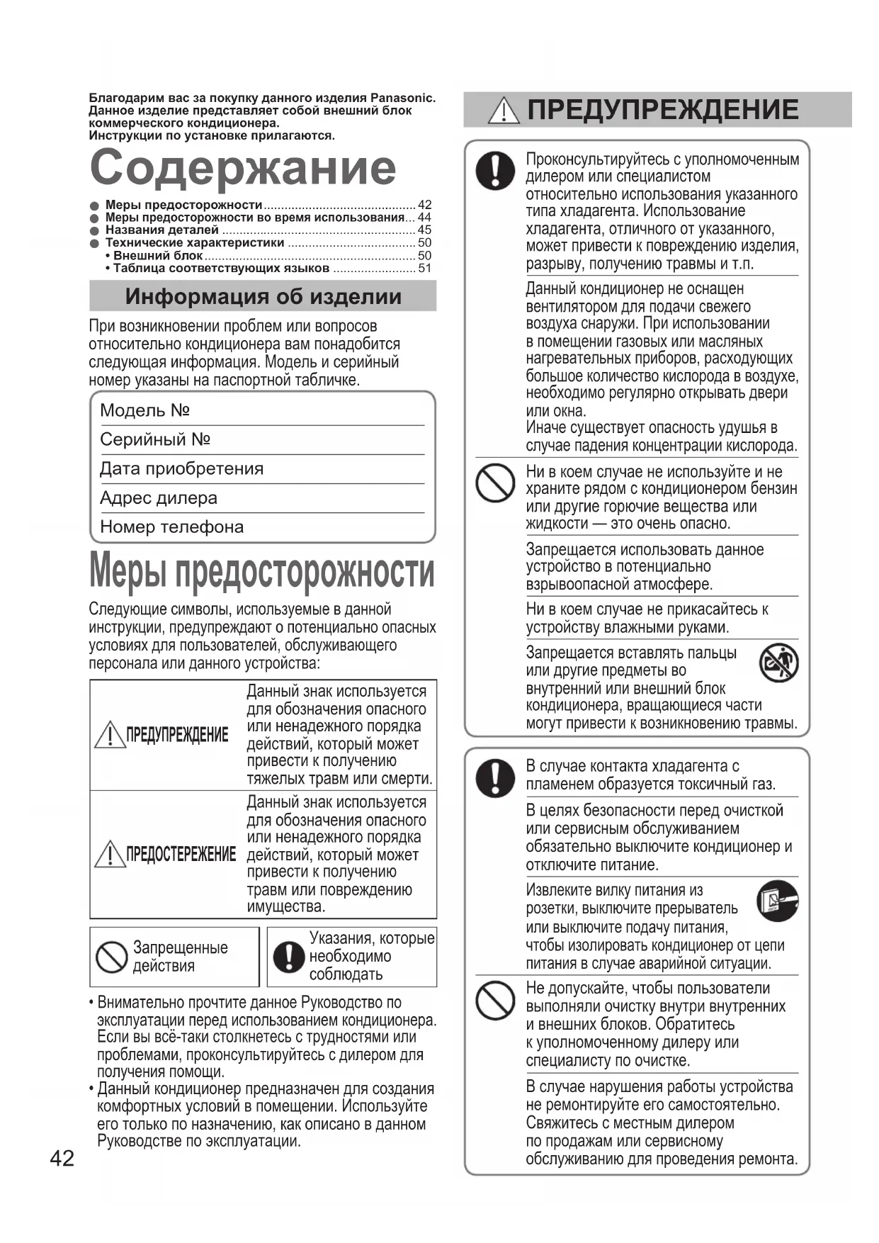 Благодарим вас за покупку данного изделия Panasonic.Данное изделие представляет собой внешний блок коммерческого кондиционера.Инструкции по установке прилагаются. Меры предосторожности Информация об изделии При возникновении проблем или вопросов относительно кондиционера вам понадобится следующая информация. Модель и серийный номер указаны на паспортной табличке.