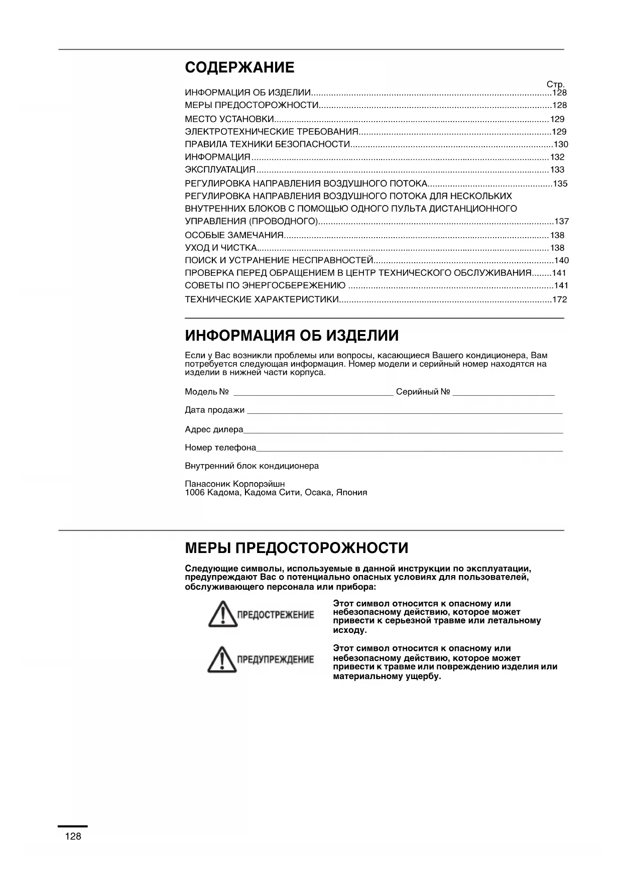 Незамедлительно свяжитесь с местным дилером для обеспечения технического обслуживания/выполнения ремонтных работ. Устройство предназначено для использования специалистами или обученными пользователями в магазинах, в легкой промышленности и на фермах, а также для коммерческого использования непрофессионалами. Не включайте и не выключайте кондиционер с помощью сетевого выключателя. Используйте функциональную кнопку ВКЛ/ВЫКЛ. Не вставляйте ничего в воздуховыпускное отверстие внешнего блока. Это опасно, так как вентилятор вращается с высокой скоростью. Не касайтесь воздухозаборного отверстия и острых алюминиевых пластин внешнего блока. Вы можете пораниться. Располагайте пожарную сигнализацию и воздуховыпускное отверстие на расстоянии не менее 1,5 м от блока. Настоящее устройство не предназначено для использования лицами (включая детей) с ограниченными физическими, сенсорными или умственными способностями, а также с недостаточными опытом или осведомленностью, за исключением случаев, когда они находятся под наблюдением или получают инструкции относительно использования устройства от лица, отвечающего за их безопасность. Необходимо следить за детьми, чтобы они не играли с устройством. Не охлаждайте и не нагревайте помещение слишком сильно, если в нем находятся маленькие дети или недееспособные люди. Не вставляйте никакие предметы в КОРПУС ВЕНТИЛЯТОРА. Вы можете получить травму или повредить устройство. Не садитесь и не вставайте на блок. Вы можете неожиданно упасть. 10_F569612_RU.fm Page 130 Wednesday, September 24, 2014 9:57 AM131 Название и адрес предприятия-изготовителя в России и Украине Название и адрес предприятия-изготовителя указаны на картонной коробке и на паспортной табличке. Для справки Украина и Россия освобождены от следования точным указаниям Директивы ЕС по фторированным