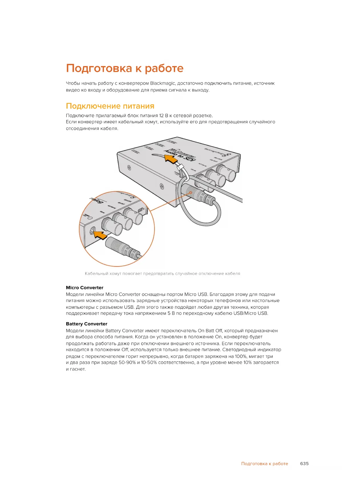 Конвертеры BlackmagicПодготовка к работе Чтобы начать работу с конвертером Blackmagic, достаточно подключить питание, источник видео ко входу и оборудование для приема сигнала к выходу. Подключение питания Подключите прилагаемый блок питания 12 В к сетевой розетке. Если конвертер имеет кабельный хомут, используйте его для предотвращения случайного отсоединения кабеля. Кабельный хомут помогает предотвратить случайное отключение кабеля Micro Converter Модели линейки Micro Converter оснащены портом Micro USB. Благодаря этому для подачи питания можно использовать зарядные устройства некоторых телефонов или настольные компьютеры с разъемом USB. Для этого также подойдет любая другая техника, которая поддерживает передачу тока напряжением 5 В по переходному кабелю USB/Micro USB. Battery Converter Модели линейки Battery Converter имеют переключатель On Batt Off, который предназначен для выбора способа питания. Когда он установлен в положение On, конвертер будет продолжать работать даже при отключении внешнего источника. Если переключатель находится в положении Off, используется только внешнее питание. Светодиодный индикатор рядом с переключателем горит непрерывно, когда батарея заряжена на 100%, мигает три идва раза при заряде 50-90% и 10-50% соответственно, апри уровне менее 10% загорается