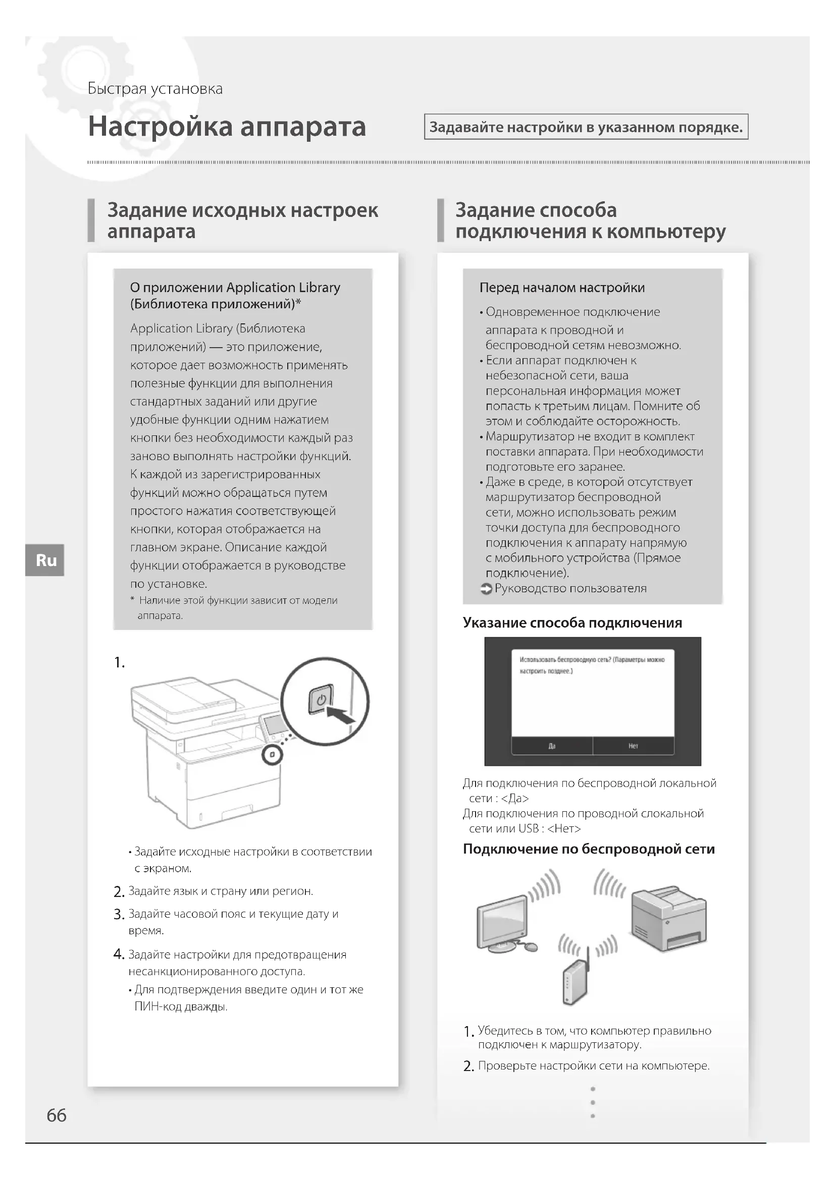 - Задайте исходные настройки в соответствии с экраном. Задайте язык и страну или регион. Задайте часовой пояс и текущие дату и время. Задайте настройки для предотвращения несанкционированного доступа.• Для подтверждения введите один и тот же ПИН-код дважды.Перед началом настройки• Одновременное подключение аппарата к проводной и беспроводной сетям невозможно.• Если аппарат подключен к небезопасной сети, ваша персональная информация может попасть к третьим лицам. Помните об этом и соблюдайте осторожность. Маршрутизатор не входит в комплект поставки аппарата. При необходимости подготовьте его заранее.• Даже в среде, в которой отсутствует маршрутизатор беспроводной сети, можно использовать режим точки доступа для беспроводного подключения к аппарату напрямую с мобильного устройства (Прямое подключение). Руководство пользователяУказание способа подключенияДля подключения по беспроводной локальной сети : <Да>Для подключения по проводной слокальной сети или USB : <Нет>Подключение по беспроводной сети Убедитесь в том, что компьютер правильно подключен к маршрутизатору. Проверьте настройки сети на компьютере.