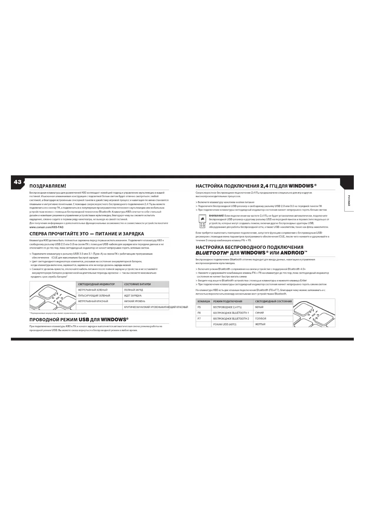 Клавиатура K83 должна быть полностью заряжена перед первым использованием. Подключите клавиатуру K83 к свободному разъему USB2.0 или3.0 на своем ПК с помощью USB-кабеля для зарядки или передачи данных и не отключайте ее до тех пор, пока светодиодный индикатор не начнет непрерывно гореть зеленым светом. Беспроводное подключение Bluetooth отлично подходит для ввода данных, навигации и управления воспроизведением мультимедиа. При подключении клавиатуры K83 к ПК и начале зарядки выполняется автоматическая смена режима работы на проводной режим USB. Вы можете снова вернуться в беспроводной режим в любое время. *Перезаряжаемые аккумуляторы имеют ограниченный срок службы СВЕТОДИОДНЫЙ ИНДИКАТОР НЕПРЕРЫВНЫЙ ЗЕЛЕНЫЙ ПУЛЬСИРУЮЩИЙ ЗЕЛЕНЫЙ СОСТОЯНИЕ БАТАРЕИ ПОЛНЫЙ ЗАРЯД ИДЕТ ЗАРЯДКА НИЗКИЙ УРОВЕНЬ КРИТИЧЕСКИ НИЗКИЙ УРОВЕНЬМИГАЮЩИЙ КРАСНЫЙ НЕПРЕРЫВНЫЙ КРАСНЫЙ Для получения информации о дополнительных функциональных возможностях и совместимости устройств посетите www.corsair.com/K83-FAQ > Подключите клавиатуру к разъему USB3.0 или3.1 (Type-A) на своем ПК с работающим программным обеспечением iCUE для максимально быстрой зарядки > Цвет светодиодного индикатора изменится, указывая на состояние аккумуляторной батареи, когда клавиатура включена, заряжается, заряжена или же когда уровень заряда низкий > Снижайте уровень яркости, отключайте кабель питания после полной зарядки устройства и не оставляйте аккумуляторную батарею разряженной на длительные периоды времени— так вы сможете максимально продлить срок службы батареи* > Включите клавиатуру нажатием кнопки питания > Подключите беспроводной USB-ресивер к свободному разъему USB2.0 или3.0 на передней панели ПК > При подключении клавиатуры светодиодный индикатор состояния начнет непрерывно гореть белым светом Если требуется выполнить повторное подключение, запустите функцию сопряжения с беспроводным USB- ресивером с помощью меню параметров программного обеспечения iCUE, после чего нажмите и удерживайте в течение 2секунд комбинацию клавиш FN+F5. ВНИМАНИЕ! Если подключение на частоте 2,4ГГц не будет установлено автоматически, подключите беспроводной USB-ресивер к другому разъему USB на передней панели и переместите подальше от устройств, которые могут создавать помехи, включая другие беспроводные адаптеры USB, оборудование для работы беспроводной сети, а также USB-накопители, такие как флеш-накопители. > Включите режим Bluetooth-сопряжения на своем устройстве с поддержкой Bluetooth4.0+ > Нажмите и удерживайте комбинацию клавиш FN+F6 на клавиатуре до тех пор, пока светодиодный индикатор состояния не начнет быстро мигать синим > Введите код вашего Bluetooth-устройства с помощью клавиатуры и нажмите клавишу Enter > При подключении клавиатуры светодиодный индикатор состояния начнет непрерывно гореть синим светом На клавиатуре K83 есть две клавиши подключения Bluetooth (F6 и F7), благодаря чему можно запоминать и с легкостью переключаться между несколькими хост-устройствами Bluetooth.