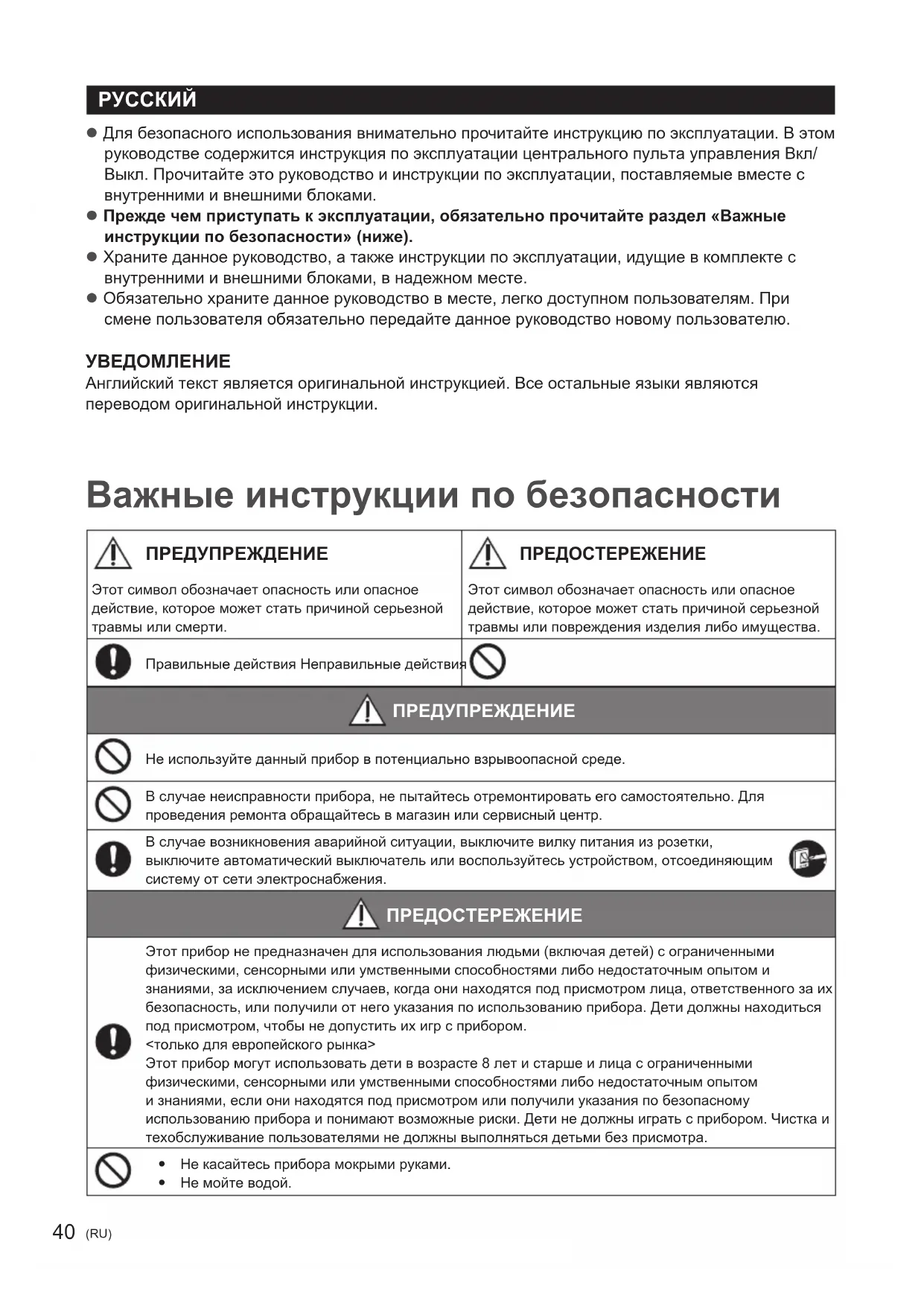 z Для безопасного использования внимательно прочитайте инструкцию по эксплуатации. В этом руководстве содержится инструкция по эксплуатации центрального пульта управления Вкл/ Выкл. Прочитайте это руководство и инструкции по эксплуатации, поставляемые вместе с внутренними и внешними блоками. z Прежде чем приступать к эксплуатации, обязательно прочитайте раздел «Важные инструкции по безопасности» (ниже). z Храните данное руководство, а также инструкции по эксплуатации, идущие в комплекте с внутренними и внешними блоками, в надежном месте. z Обязательно храните данное руководство в месте, легко доступном пользователям. При смене пользователя обязательно передайте данное руководство новому пользователю. УВЕДОМЛЕНИЕ Английский текст является оригинальной инструкцией. Все остальные языки являются переводом оригинальной инструкции. Важные инструкции по безопасности ПРЕДУПРЕЖДЕНИЕ ПРЕДОСТЕРЕЖЕНИЕ Этот символ обозначает опасность или опасное действие, которое может стать причиной серьезной травмы или смерти. Этот символ обозначает опасность или опасное действие, которое может стать причиной серьезной травмы или повреждения изделия либо имущества. Правильные действия Неправильные действия ПРЕДУПРЕЖДЕНИЕ Не используйте данный прибор в потенциально взрывоопасной среде. В случае неисправности прибора, не пытайтесь отремонтировать его самостоятельно. Для проведения ремонта обращайтесь в магазин или сервисный центр. В случае возникновения аварийной ситуации, выключите вилку питания из розетки, выключите автоматический выключатель или воспользуйтесь устройством, отсоединяющим систему от сети электроснабжения. ПРЕДОСТЕРЕЖЕНИЕ Этот прибор не предназначен для использования людьми (включая детей) с ограниченными физическими, сенсорными или умственными способностями либо недостаточным опытом и знаниями, за исключением случаев, когда они находятся под присмотром лица, ответственного за их безопасность, или получили от него указания по использованию прибора. Дети должны находиться под присмотром, чтобы не допустить их игр с прибором. <только для европейского рынка> Этот прибор могут использовать дети в возрасте 8 лет и старше и лица с ограниченными физическими, сенсорными или умственными способностями либо недостаточным опытом и знаниями, если они находятся под присмотром или получили указания по безопасному использованию прибора и понимают возможные риски. Дети не должны играть с прибором. Чистка и техобслуживание пользователями не должны выполняться детьми без присмотра. y Не касайтесь прибора мокрыми руками. y Не мойте водой. CZ-ANC3_ACXF55-19832.indd 40 2021/09/28 10:43:5241 (RU) Предостережения по эксплуатации z Не размещайте устройство в следующих