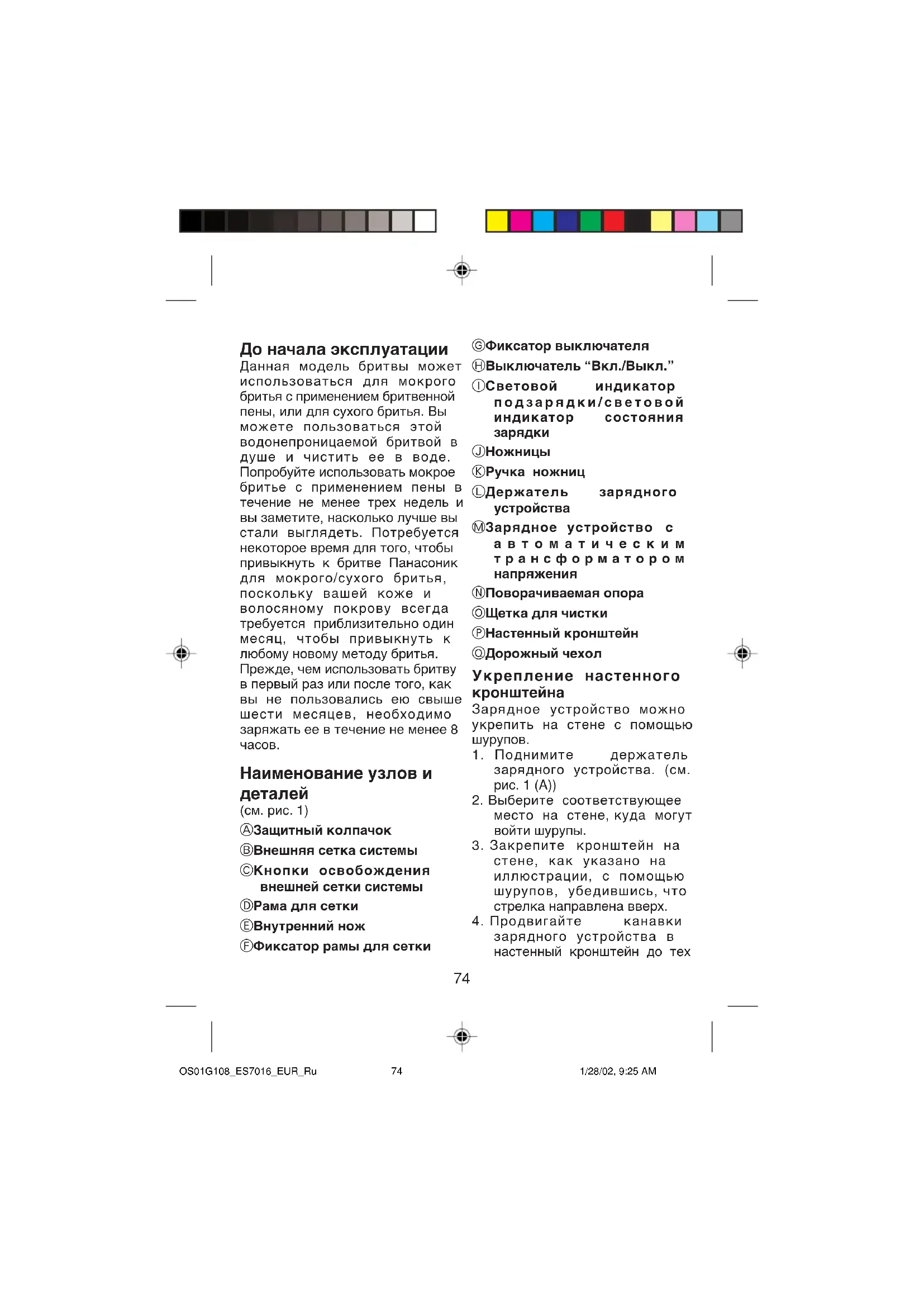 - Всегда применяйте бритву по назначению, как указано в данном руководстве. Установленный производителем в порядке п. 2 ст.5 Федерального Закона РФ “О защите прав потребителей” срок службы для данного изделия равен 7 годам с даты производства при условии, что изделие используется в строгом соответствии с настоящей инструкцией по эксплуатации и применимыми техническими стандартами. Этот прибор предназначен только для домашнего использования. Сделано е Японии OS01G108_ES7016_EUR_Ru 1/28/02, 9:25 AM79No.1 EN, GR, FR, IT, NE, SP, DN, PO, NR, SW, FN, Po, Cz, Hu, Ru, Russi Printed in China Matsushita Electric Works, Ltd. 1048, Kadoma, Osaka 571-8686, Japan P01-04(ES7016欧州)02.1.3119:50ページ1