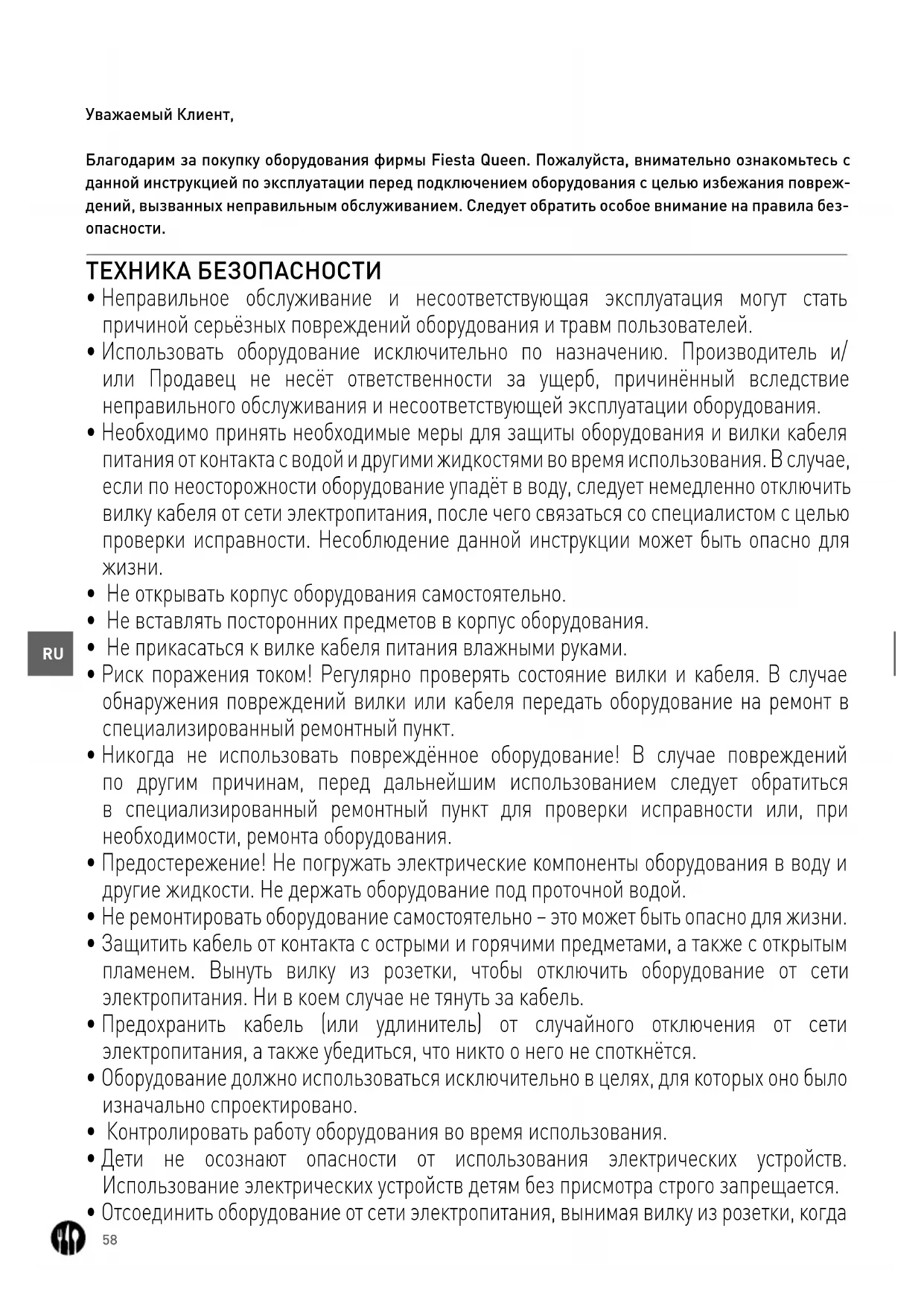Уважаемый Клиент, Благодарим за покупку оборудования фирмы Fiesta Queen. Пожалуйста, внимательно ознакомьтесь с данной инструкцией по эксплуатации перед подключением оборудования с целью избежания повреж- дений, вызванных неправильным обслуживанием. Следует обратить особое внимание на правила без-