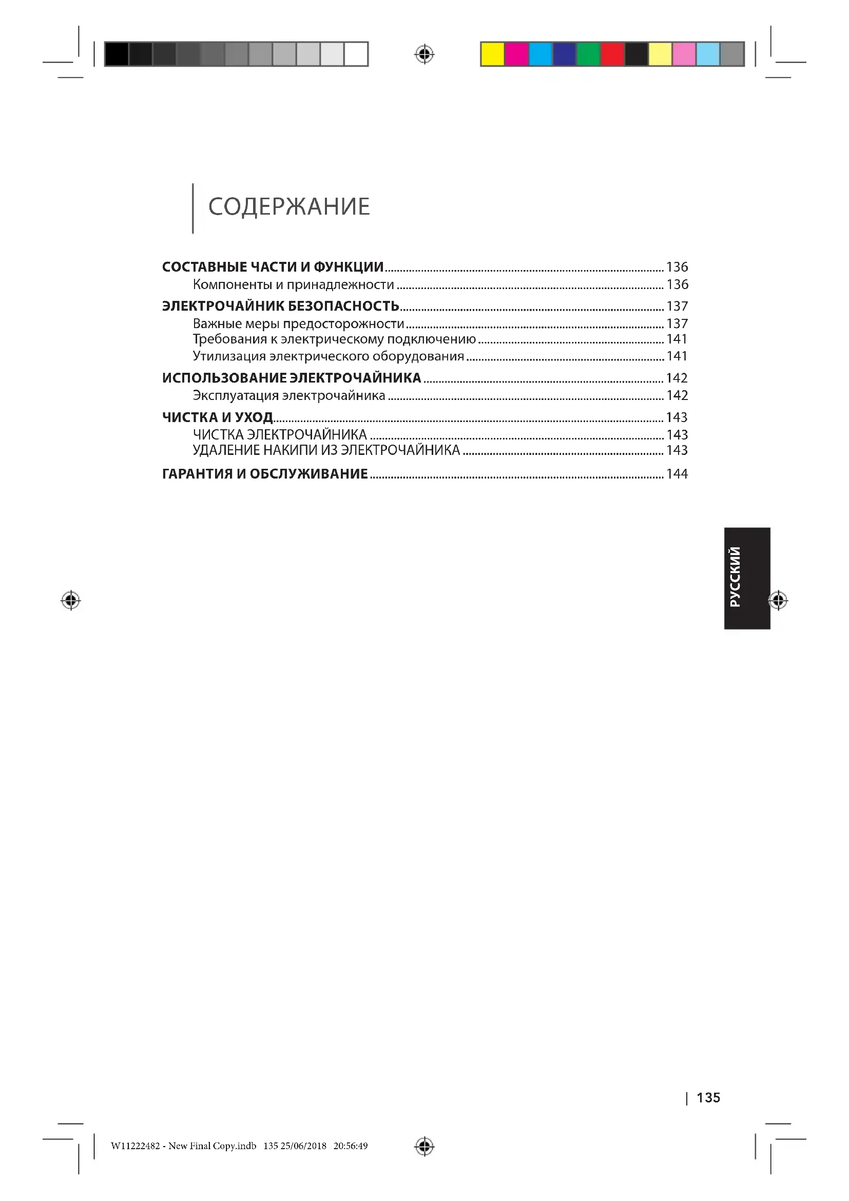 СОСТАВНЫЕ ЧАСТИ И ФУНКЦИИ 136 Компоненты и принадлежности 136 ЭЛЕКТРОЧАЙНИК БЕЗОПАСНОСТЬ137 Важные меры предосторожности 137 Требования к электрическому подключению 141 Утилизация электрического оборудования 141 ИСПОЛЬЗОВАНИЕ ЭЛЕКТРОЧАЙНИКА 142 Эксплуатация электрочайника 142 ЧИСТКА И УХОД 143 ЧИСТКА ЭЛЕКТРОЧАЙНИКА 143 УДАЛЕНИЕ НАКИПИ ИЗ ЭЛЕКТРОЧАЙНИКА 143 ГАРАНТИЯ И ОБСЛУЖИВАНИЕ 144 W11222482 - New Final Copy.indb 135 25/06/2018 20:56:49136 | СОСТАВНЫЕ ЧАСТИ И ФУНКЦИИ СОСТАВНЫЕ ЧАСТИ И ФУНКЦИИ КОМПОНЕНТЫ И ПРИНАДЛЕЖНОСТИ