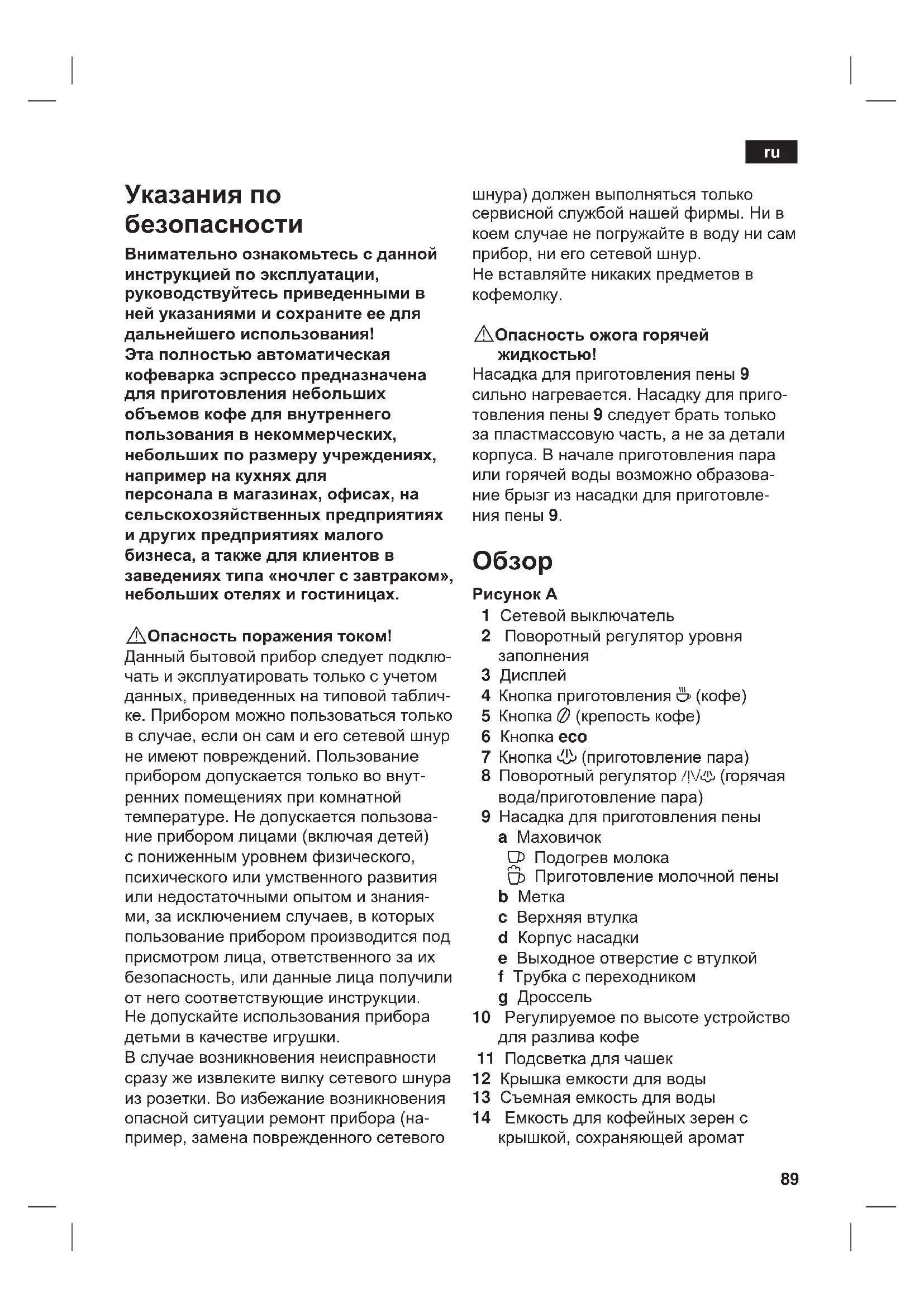 Указания по безопасности Внимательно ознакомьтесь с данной инструкцией по эксплуатации, руководствуйтесь приведенными в ней указаниями и сохраните ее для дальнейшего использования! Эта полностью автоматическая кофеварка эспрессо предназначена для приготовления небольших объемов кофе для внутреннего пользования в некоммерческих, небольших по размеру учреждениях, например на кухнях для персонала в магазинах, офисах, на сельскохозяйственных предприятиях и других предприятиях малого бизнеса, а также для клиентов в заведениях типа «ночлег с завтраком», небольших отелях и гостиницах.