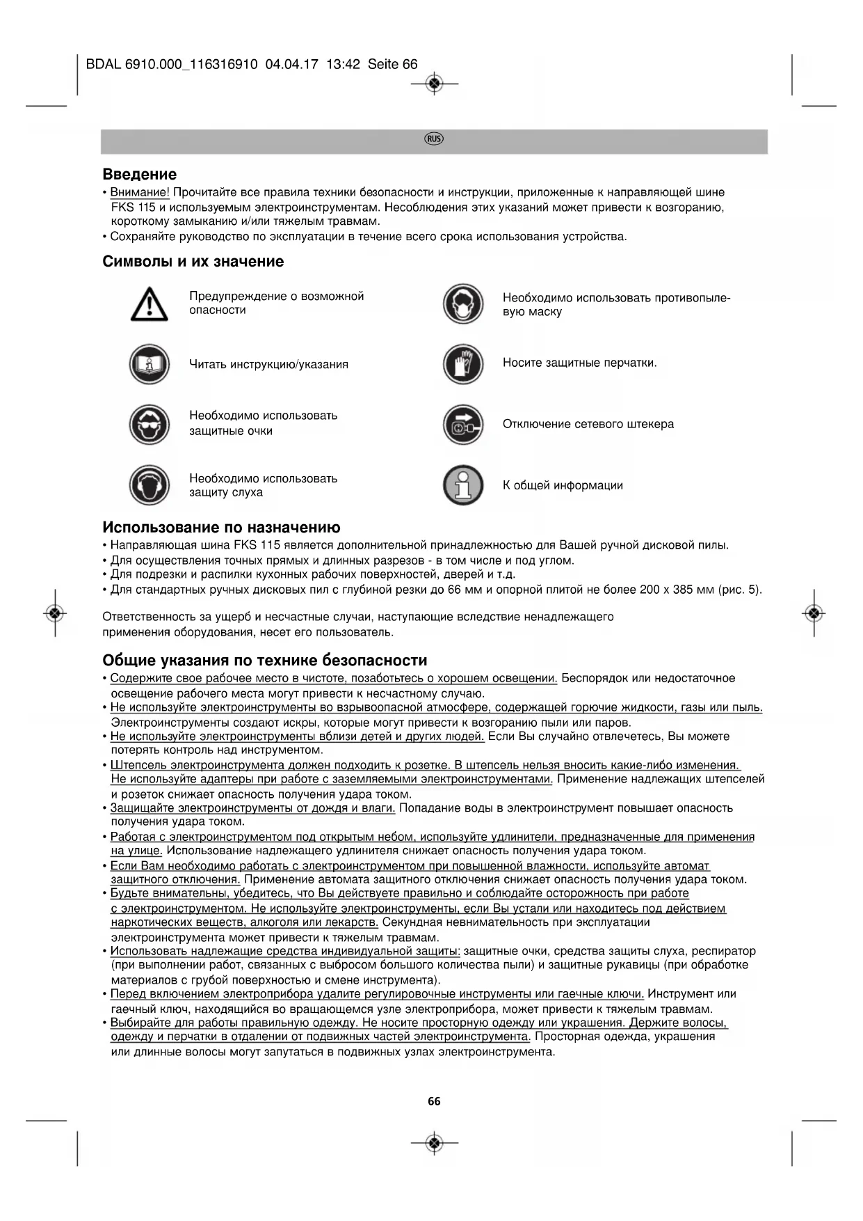 - Для стандартных ручных дисковых пил с глубиной резки до 66 мм и опорной плитой не более 200 x 385 мм (рис. 5). Ответственность за ущерб и несчастные случаи, наступающие вследствие ненадлежащего применения оборудования, несет его пользователь. Общие указания по технике безопасности