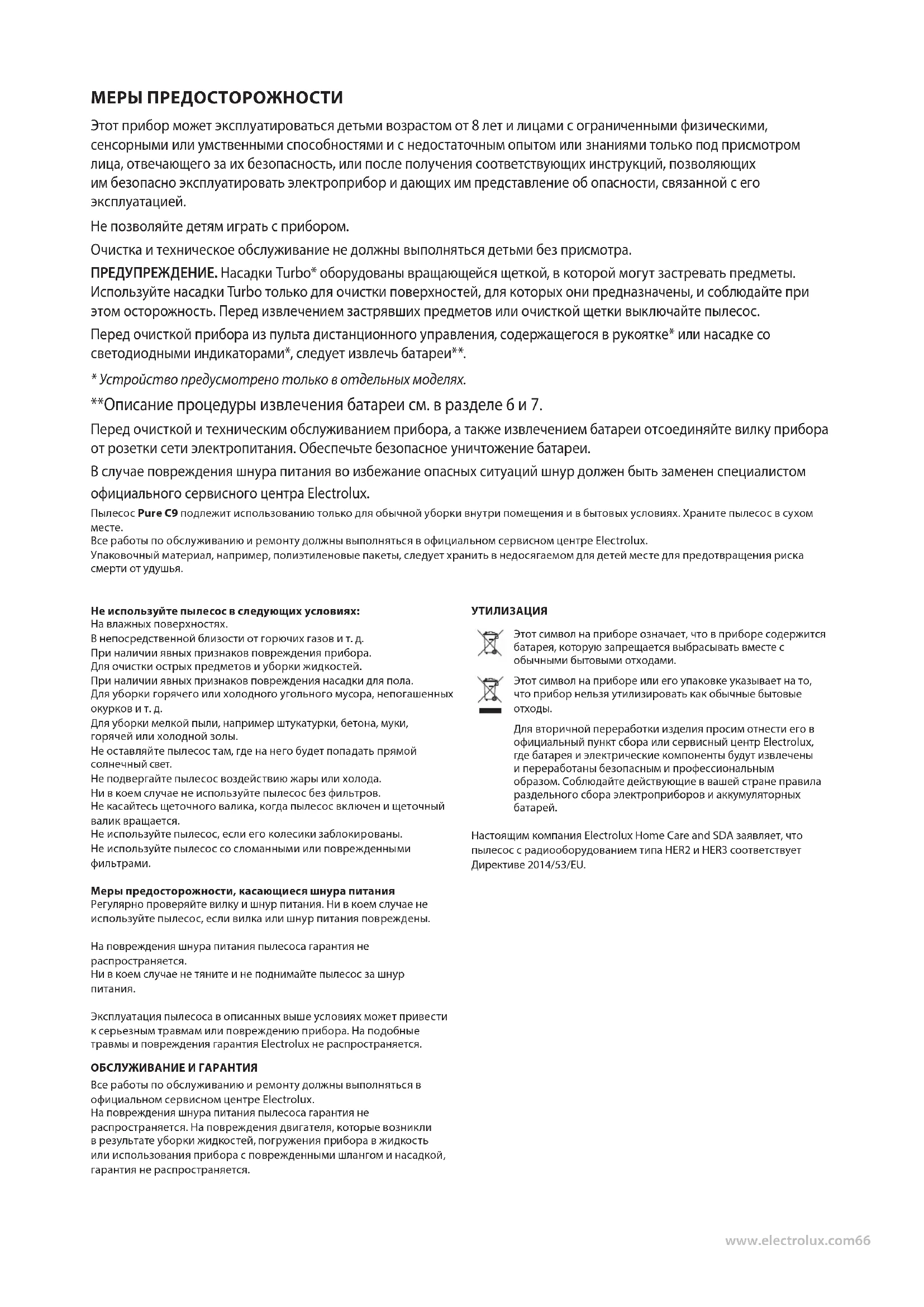- Устройство предусмотрено только в отдельных моделях. **Описание процедуры извлечения батареи см. в разделе 6 и 7. Перед очисткой и техническим обслуживанием прибора, а также извлечением батареи отсоединяйте вилку прибора от розетки сети электропитания. Обеспечьте безопасное уничтожение батареи. В случае повреждения шнура питания во избежание опасных ситуаций шнур должен быть заменен специалистом официального сервисного центра Electrolux. Пылесос Pure C9 подлежит использованию только для обычной уборки внутри помещения и в бытовых условиях. Храните пылесос в сухом