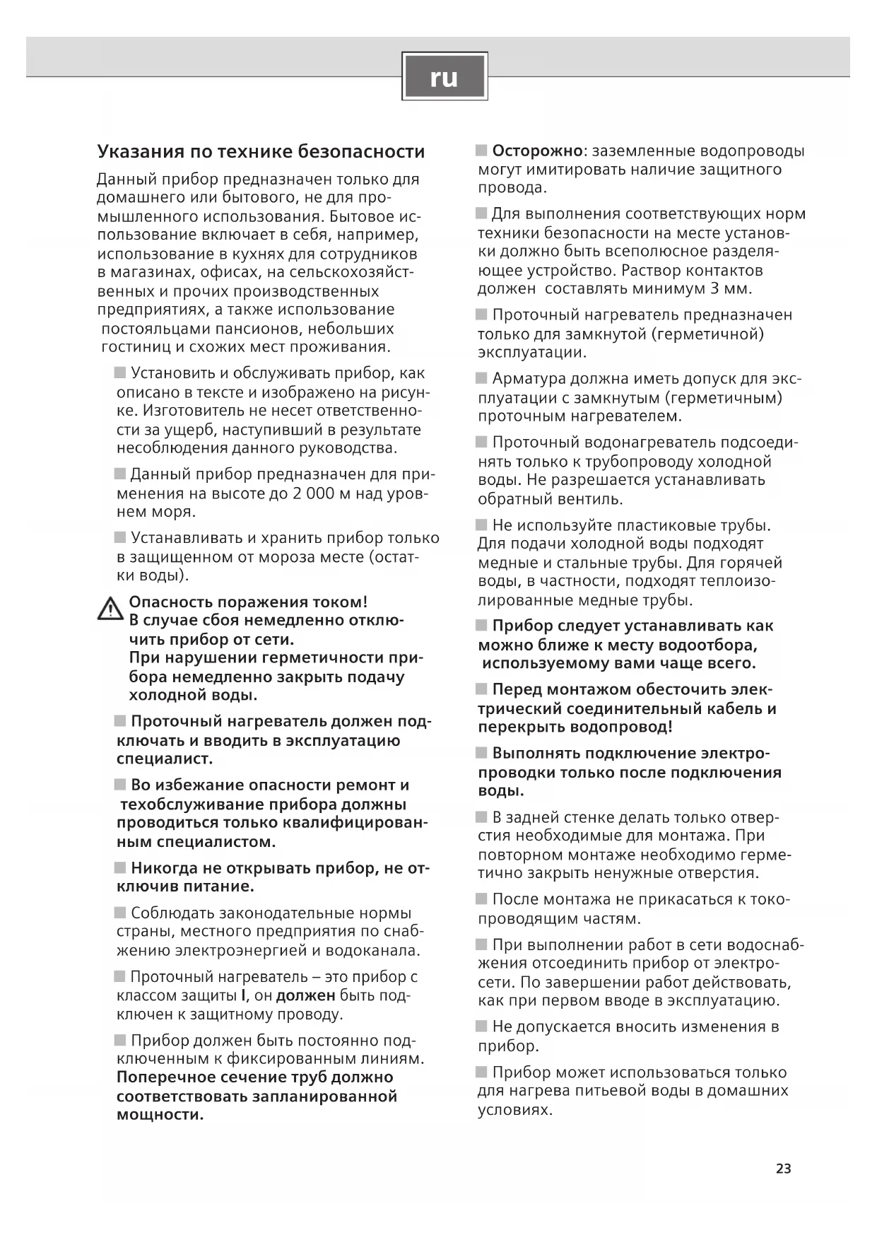 Инструкция по эксплуатации Пожалуйста, прочтите и соблюдайте подробные ука-зания по безопасности в начале данной инструкции! ■ Важно: Никогда не подвергайте прибор воздействию мороза!Опасность удара током!В случае сбоя немедленно отключить прибор от сети. ■ При негерметичности прибора немедленно пере-кройте подачу холодной воды. Ознакомление с прибором В проточном нагревателе вода нагревается за то время, пока она по нему протекает. И только в это время нагре-ватель потребляет электроэнергию.Водонагреватель может снабжать горячей водой не-сколько мест водоотбора. При этом водонагреватель следует устанавливать как можно ближе к месту водоот-бора, используемому Вами чаще всего. Тем самым вы сэкономите электроэнергию. Управление прибором ■ Откройте кран горячей воды.Проточный водонагреватель включается и нагревает воду при протекании ее через прибор.Когда Вы закрываете кран, водонагреватель снова выключается. Повышение температуры нагрева воды При полностью открытом кране мощности водонагрева-теля может недоставать для нагревания воды до желае-мой температуры. ■ Слегка прикройте кран. Вода будет протекать по водонагревателю медленнее и станет горячее. Понижение температуры нагрева воды ■ Смешивать с холодной водой. Экономия электроэнергии Чтобы минимизировать расход электроэнергии при вы-ключении горячей воды:– Закрывайте кран горячей воды медленно, чтобы использовать остаточное тепло проточного водонагревателя.– Тем самым предотвращается кратковременное повы-шение температуры выше выбранного значения при повторном открытии горячей воды в течение ближай-ших нескольких минут после закрывания.Для обеспечения равномерной температуры воды реко-мендовано использование термостатных смесителей.Термостатные смесители должны быть пригодны для проточных водонагревателей с гидравлическим управлением. Зимний режим Указание: в зимнее время температура воды на входе может понижаться, и в результате этого не будет достиг-нута нужная температура на выходе. ■ Чтобы компенсировать понижение температуры, не-обходимо уменьшать количество воды с помощью крана до тех пор, пока не будет достигнута необходи-мая температура горячей воды. Чистка нагревателя ■ Поверхность нагревателя следует лишь протирать влажной тряпкой. Ни в коем случае не используйте для чистки острые предметы или абразивные чистя-щие средства!Указания: При обычных обстоятельствах нагреватель не нужно очищать от накипи. Но в случае с очень жёсткой водой и при частом отборе очень горячей воды нагрева-тель может покрыться накипью. Если это случилось, то обращайтесь в нашу сервисную службу. Неисправность, что делать? Внимание!Любые работы по ремонту должны выполняться только специалистами. Неквалифицированно от-ремонтированный нагреватель может стать для Вас источником серьезной опасности.Если прибор не работает так, как нужно, причиной часто может быть какая-нибудь мелочь. Проверьте, возможно ли самостоятельно устранить неисправность на основа-нии данных указаний. Таким образом можно сократить расходы на ненужное использование сервисных услуг.Вода не нагревается или из крана течет недостаточно воды: ■ Проверить предохранитель в домашней установке. ■ Падение давления в водопроводной сети. При низком давлении прибор не включается. ■ Зас