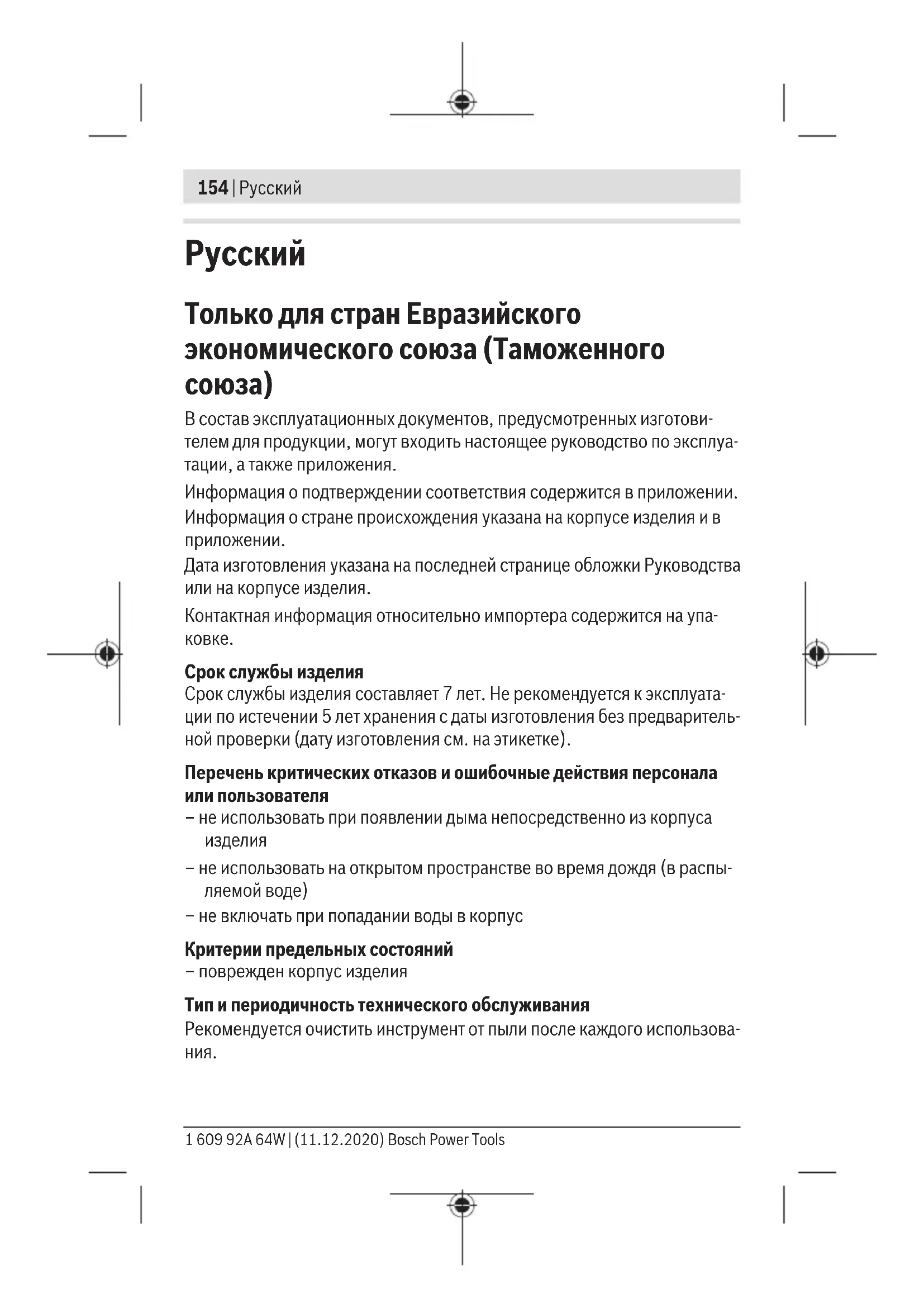 u Осторожно – применение инструментов для обслуживания или юстировки или процедур техобслуживания, кроме указанных здесь, может привести к опасному воздействию излучения. u Измерительный инструмент поставляется с предупредительной табличкой лазерного излучения (показана на странице с изобра- жением измерительного инструмента). Bosch Power Tools 1 609 92A 64W | (11.12.2020)156 | Русский u Если текст предупредительной таблички лазерного излучения не на Вашем родном языке, перед первым запуском в эксплуата- цию заклейте ее наклейкой на Вашем родном языке, которая входит в объем поставки. Не направляйте луч лазера на людей или животных и сами не смотрите на прямой или отражаемый луч ла- зера. Этот луч может слепить людей, стать причиной не- счастного случая или повредить глаза. u В случае попадания лазерного луча в глаз глаза нужно намерен- но закрыть и немедленно отвернуться от луча. u Не меняйте ничего в лазерном устройстве. u Не используйте очки для работы с лазерным инструментом (при- надлежность) в качестве защитных очков. Очки для работы с ла- зерным инструментом обеспечивают лучшее распознавание лазер- ного луча, но не защищают от лазерного излучения. u Не используйте очки для работы с лазерным инструментом (при- надлежность) в качестве солнцезащитных очков или за рулем. Очки для работы с лазером не обеспечивают защиту от УФ-излучения и мешают правильному цветовосприятию. u Ремонт измерительного инструмента разрешается выполнять только квалифицированному персоналу и только с использовани- ем оригинальных запчастей. Этим обеспечивается безопасность из- мерительного инструмента. u Не позволяйте детям пользоваться лазерным измерительным инструментом без присмотра. Дети могут по неосторожности осле- пить себя или посторонних людей. u Не работайте с измерительным инструментом во взрывоопасной среде, поблизости от горючих жидкостей, газов и пыли. В измери- тельном инструменте могут образоваться искры, от которых может воспламениться пыль или пары. Не устанавливайте магнит вблизи имплантантов и прочих медицинских аппаратов, напр., кардиостиму- ляторов и инсулиновых насосов. Магнит создает поле, которое может воздействовать на работу имплантантов и медицинских аппаратов. 1 609 92A 64W | (11.12.2020) Bosch Power ToolsРусский | 157 u Держите измерительный инструмент вдали от магнитных носи- телей данных и от приборов, чувствительных к магнитному полю. Воздействие магнитов может приводить к невосполнимой потере