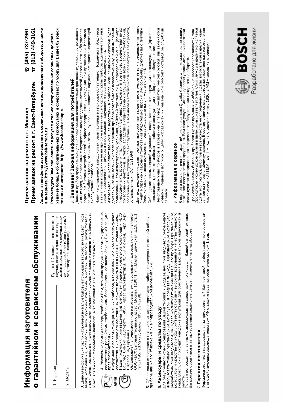 (812) 449-3161 Адреса и телефоны авторизованных сервисных центров приведены на обороте, а также в интернете: http://www.bsh-service.ru Рекомендуем Вам пользоваться услугами только авторизованных сервисных центров. Узнайте больше об оригинальных аксессуарах и средствах по уходу для Вашей бытовой техники в интернете: http: //www.bosch-eshop.ru 1. Изделие __________________________________________________2. Модель __________________________________________________3. Данная информация распространяется на малые бытовые приборы товарного знака Bosch: кофе-варки, кофемашины, кофемолки, весы, кухонные комбайны, миксеры, пылесосы, резки, тостеры, утюги, фены, распрямители для волос, электрочайники, соковыжималки, измельчители, блендеры, гладильные доски, массажеры, ванночки, электрогрелки и аналогичные им изделия.4. Уважаемые дамы и господа, сообщаем Вам, что наша продукция сертифицирована на соответствие российским требованиям безопасности согласно Закону РФ «О защите прав потребителей».Информацию по сертификации наших приборов, а также данные о номере сертификата соответствия и сроке его действия Вы можете получить в ООО «БСХ Бытовая техника». Наша продукция произведена под контролем транснациональной корпорации «БСХ Бош унд Сименс Хаусгерете ГмбХ», адрес штаб-квартиры: 81739 Мюнхен, Карл-Вери Штрассе 34, Германия. Организацией, уполномоченной изготовителем на основании договора с ним, является ООО «БСХ Бытовая техника», адрес: Москва, 119071, ул. Малая Калужская, д.19, стр.1; тел.: (495) 737-2777, факс: (495) 737-2798.5. Обязательные сведения о технических характеристиках прибора приведены на типовой табличке прибора или на его этикетке и/или в сопроводительной документации.