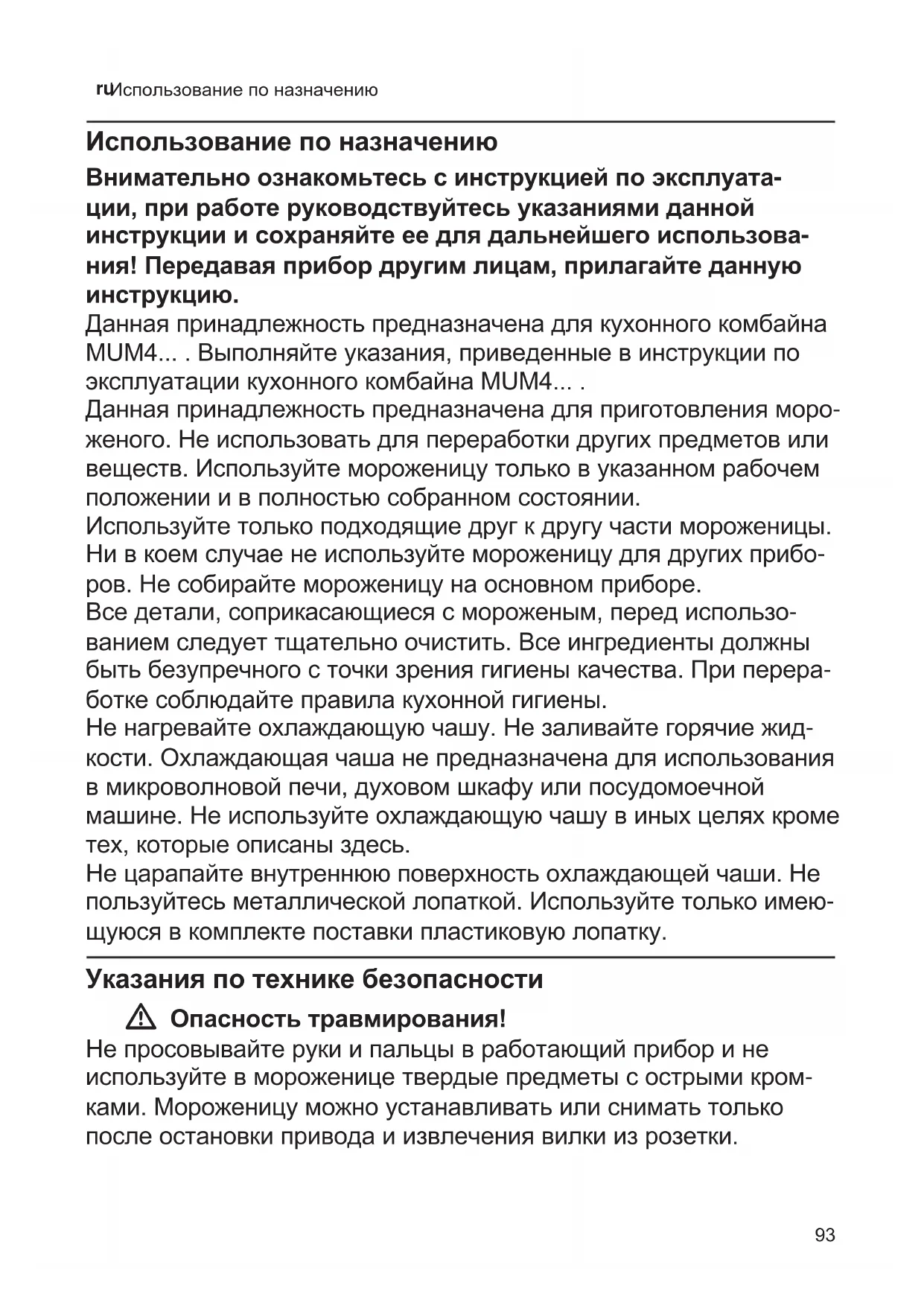 Использование по назначению Использование по назначению Внимательно ознакомьтесь с инструкцией по эксплуата- ции, при работе руководствуйтесь указаниями данной инструкции и сохраняйте ее для дальнейшего использова- ния! Передавая прибор другим лицам, прилагайте данную инструкцию. Данная принадлежность предназначена для кухонного комбайна MUM4... . Выполняйте указания, приведенные в инструкции по эксплуатации кухонного комбайна MUM4... . Данная принадлежность предназначена для приготовления моро- женого. Hе использовать для переработки других предметов или веществ. Используйте мороженицу только в указанном рабочем положении и в полностью собранном состоянии. Используйте только подходящие друг к другу части мороженицы. Ни в коем случае не используйте мороженицу для других прибо- ров. Не собирайте мороженицу на основном приборе. Все детали, соприкасающиеся с мороженым, перед использо- ванием следует тщательно очистить. Все ингредиенты должны быть безупречного с точки зрения гигиены качества. При перера- ботке соблюдайте правила кухонной гигиены. Не нагревайте охлаждающую чашу. Не заливайте горячие жид- кости. Охлаждающая чаша не предназначена для использования в микроволновой печи, духовом шкафу или посудомоечной машине. Не используйте охлаждающую чашу в иных целях кроме тех, которые описаны здесь. Hе царапайте внутреннюю поверхность охлаждающей чаши. Hе пользуйтесь металлической лопаткой. Используйте только имею- щуюся в комплекте поставки пластиковую лопатку. Указания по технике безопасности W Опасность травмирования! Не просовывайте руки и пальцы в работающий прибор и не используйте в мороженице твердые предметы с острыми кром- ками. Мороженицу можно устанавливать или снимать только после остановки привода и извлечения вилки из розетки.94 ru Обзор