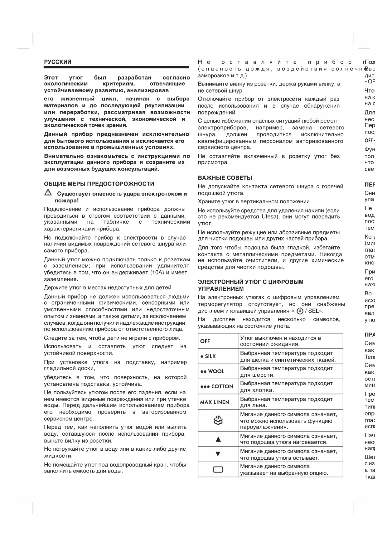 Не используйте режущие или абразивные предметы для чистки подошвы или других частей прибора. Для того чтобы подошва была гладкой, избегайте контакта с металлическими предметами. Никогда не используйте очистители, и другие химические средства для чистки подошвы. ЭЛЕКТРОННЫЙ УТЮГ С ЦИФРОВЫМ УПРАВЛЕНИЕМ На электронных утюгах с цифровым управлением терморегулятор отсутствует, но они снабжены дисплеем и клавишей управления « / SEL». На дисплее находится несколько символов, указывающих на состояние утюга. OFF Утюг выключен и находится в состоянии ожидания. ● SILK Выбранная температура подходит для шелка и синтетических тканей. ●● WOOL Выбранная температура подходит для шерсти. ●●● COTTON Выбранная температура подходит для хлопка. MAX LINEN Выбранная температура подходит