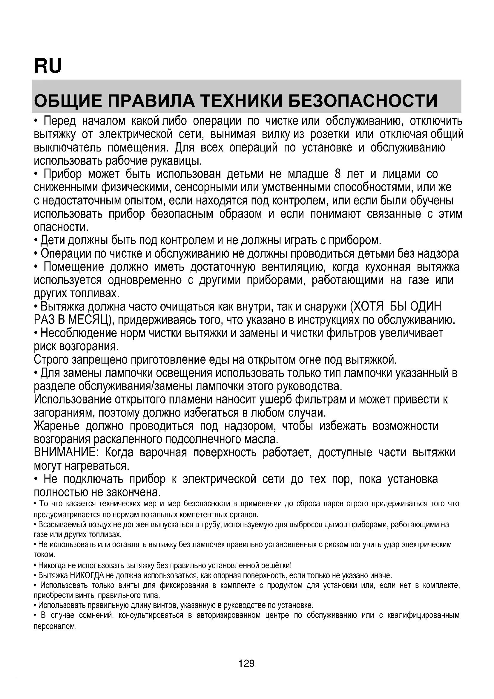 - Вытяжка НИКОГДА не должна использоваться, как опорная поверхность, если только не указано иначе.