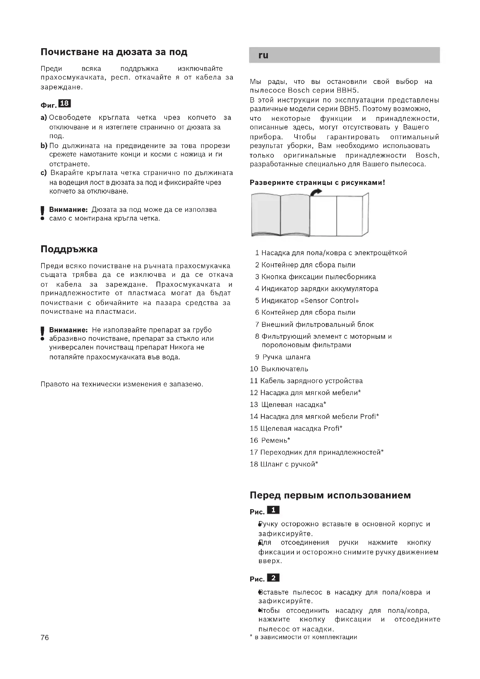 Мы рады, что вы остановили свой выбор на пылесосе Bosch серии BBH5. В этой инструкции по эксплуатации представлены различные модели серии BBH5. Поэтому возможно, что некоторые функции и принадлежности, описанные здесь, могут отсутствовать у Вашего прибора. Чтобы гарантировать оптимальный результат уборки, Вам необходимо использовать только оригинальные принадлежности Bosch, разработанные специально для Вашего пылесоса. Разверните страницы с рисунками! 1 Насадка для пола/ковра с электрощёткой 2 Контейнер для сбора пыли 3 Кнопка фиксации пылесборника 4 Индикатор зарядки аккумулятора 5 Индикатор «Sensor Control» 6 Контейнер для сбора пыли 7 Внешний фильтровальный блок 8 Фильтрующий элемент с моторным и поролоновым фильтрами 9 Ручка шланга 10 Выключатель 11 Кабель зарядного устройства 12 Насадка для мягкой мебели* 13 Щелевая насадка* 14 Насадка для мягкой мебели Profi* 15 Щелевая насадка Profi* 16 Ремень* 17 Переходник для принадлежностей* 18 Шланг с ручкой* Перед первым использованием